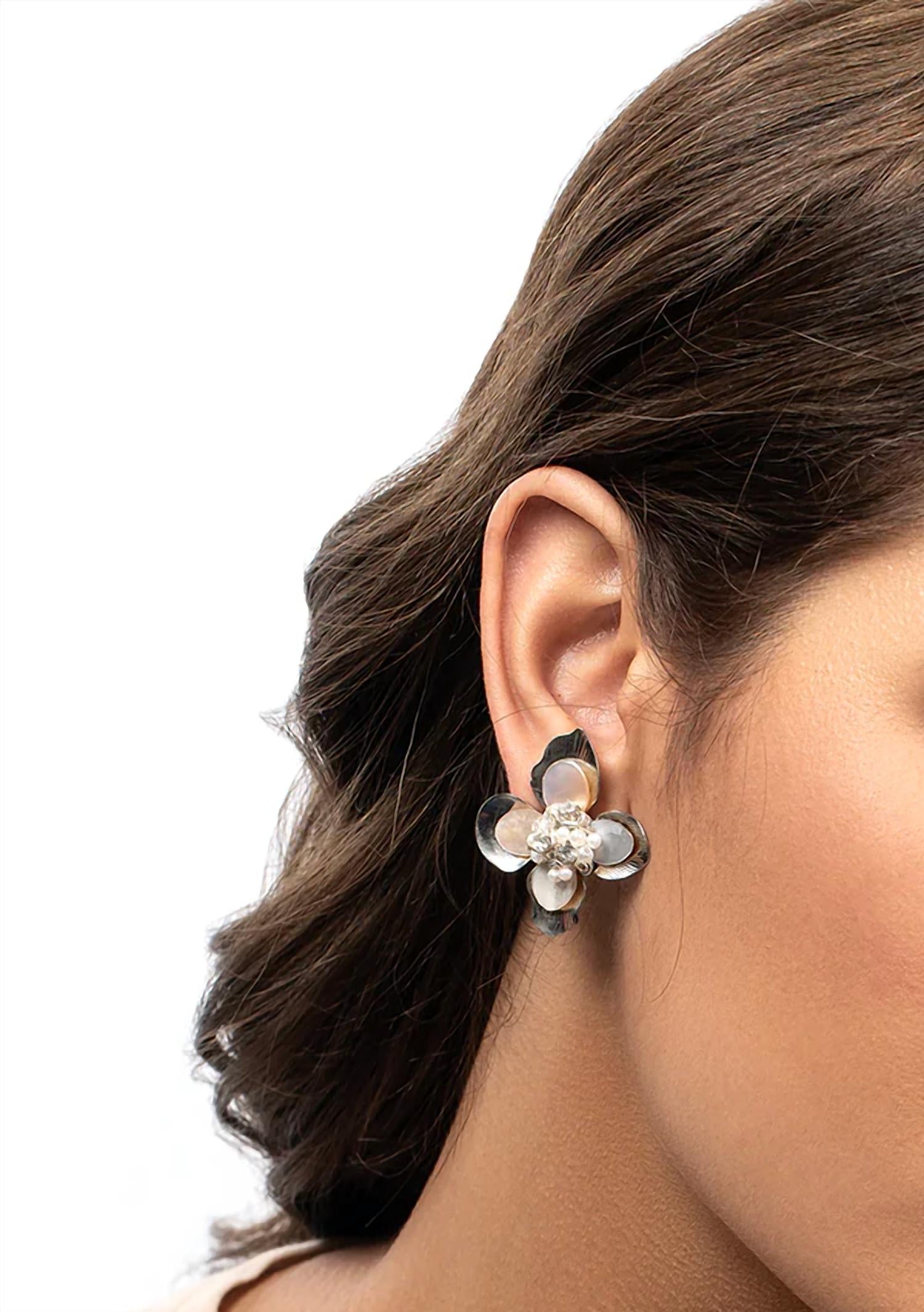 Classic earrings that will take you from season to season. Elevate your style with the Azura Earrings by DEEPA GURNANI. These silver floral stud earrings, adorned with round brilliant white pearls, are crafted in a blend of cotton, brass, glass beads, glass stone, mother of pearl, and cotton thread, with a sleek suede backing for added comfort. Designed with a lightweight mild steel post closure, they make an elegant fashion statement. These fashion earrings, embodying June's birthstone, are a perfect addition to any outfit.
