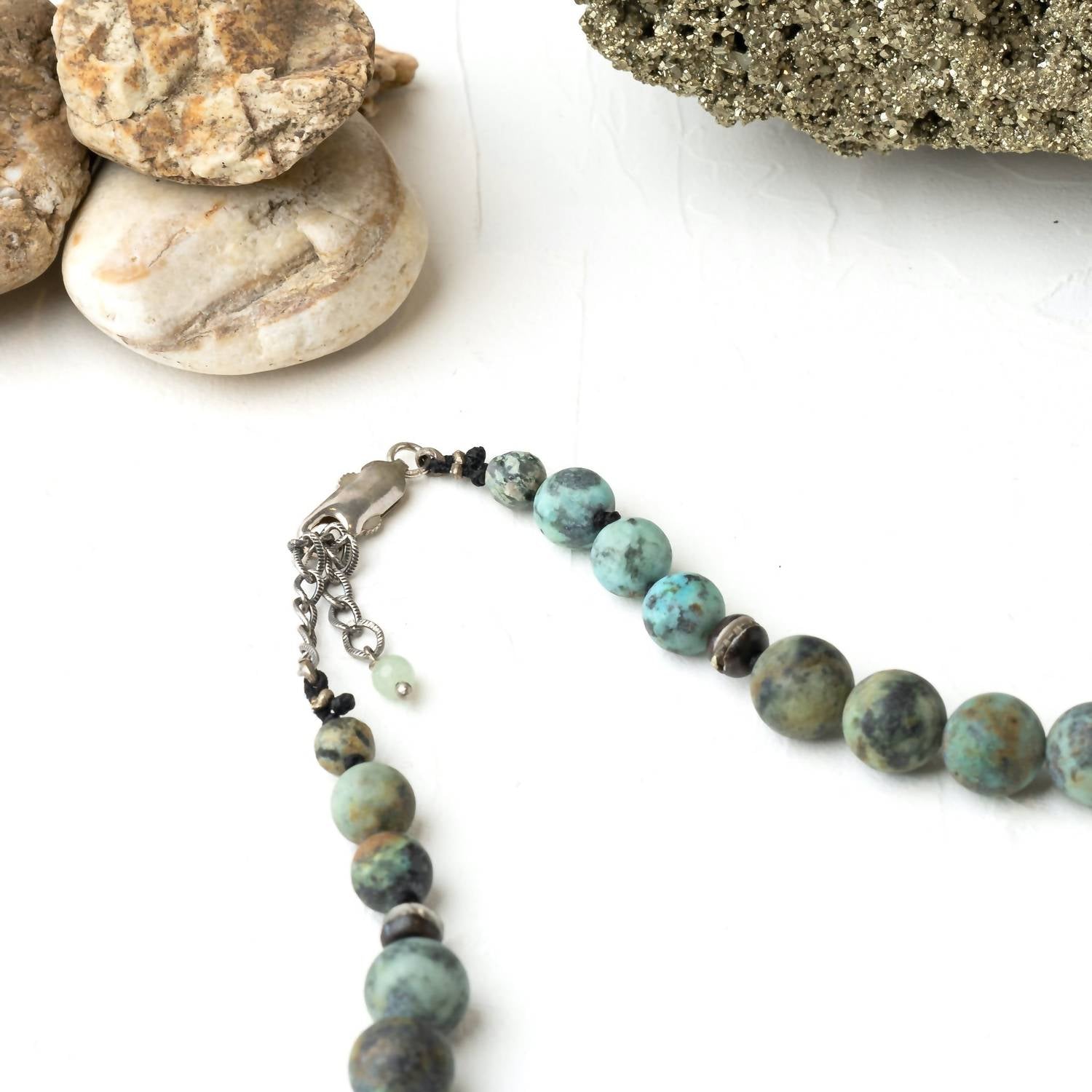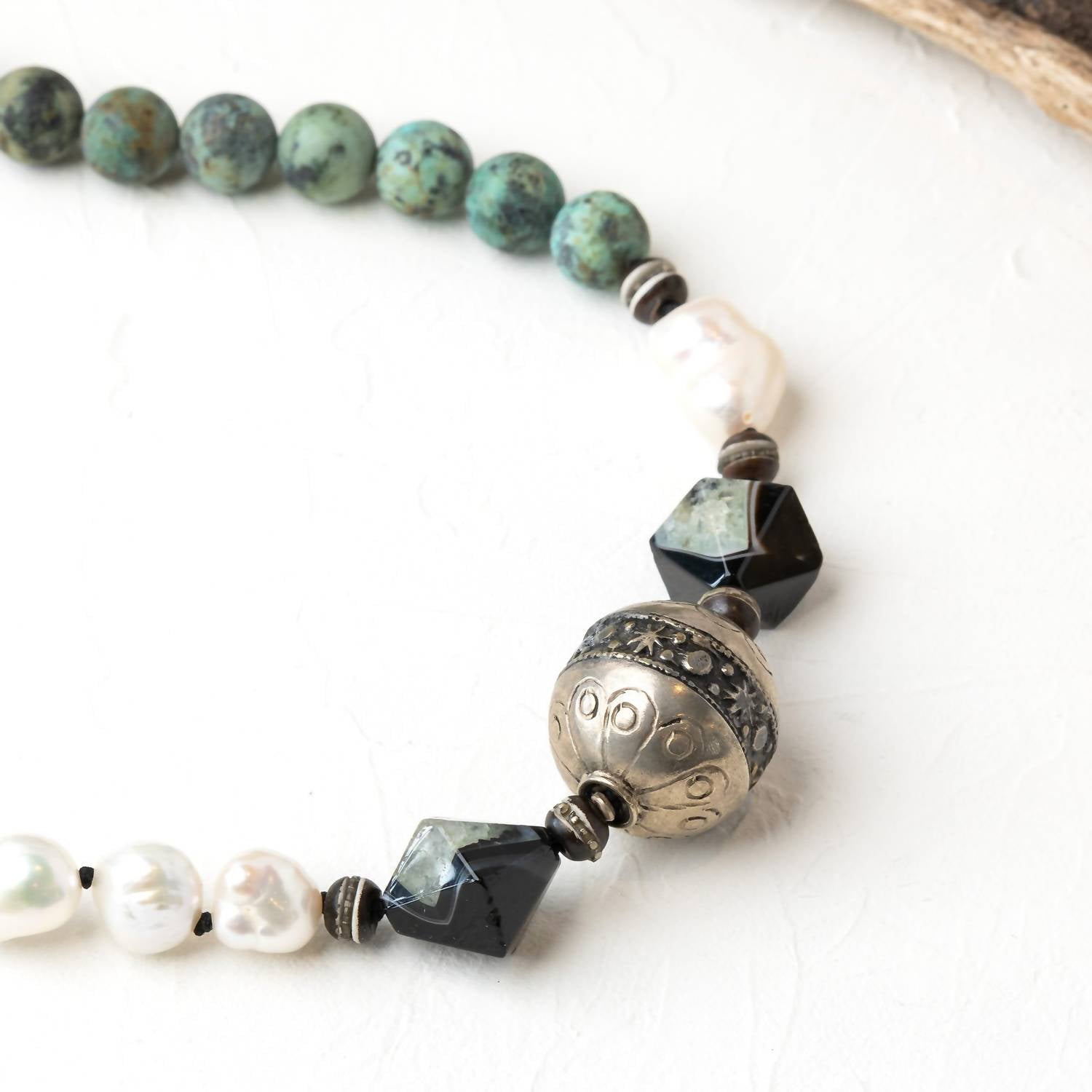Layer this necklace or wear it on its own. Either way it's a win-win. Introducing the Tribal 1 Necklace by BijouRocks, a stunning centerpiece from the Tribal Collection, celebrating tradition with a spiritual flair. This one-of-a-kind necklace features a sterling silver extender chain and clasp, alongside an exquisite mix of silver Moroccan artisanal Berber beads, freshwater pearls, and silver inlaid African black beads. Complemented with matte African green turquoise, black agate, and green quartz, every detail tells a story. Meticulously crafted with a hand-knotted cord, it embodies a unique and vibrant aesthetic for the discerning jewelry enthusiast.