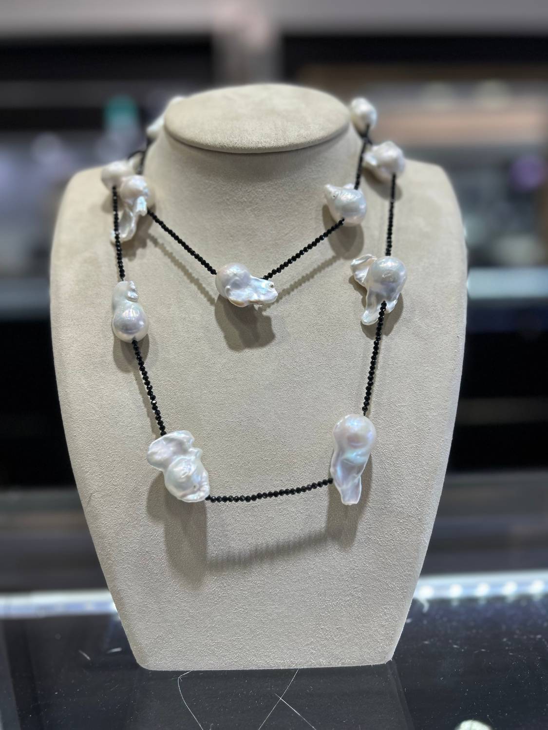 Both understated and impactful, you'll be reaching for this one-of-a-kind necklace season after season. Introducing the Women's Spinel & Baroque Pearls Necklace by Normani, an elegant addition to any jewelry collection. This piece showcases stunning Baroque pearl stations set against a striking black spinel strand. With a generous length of 36", it drapes beautifully, adding an exquisite touch to any outfit. The fashion-forward necklace combines the timeless allure of pearls with the contemporary edge of black spinels.