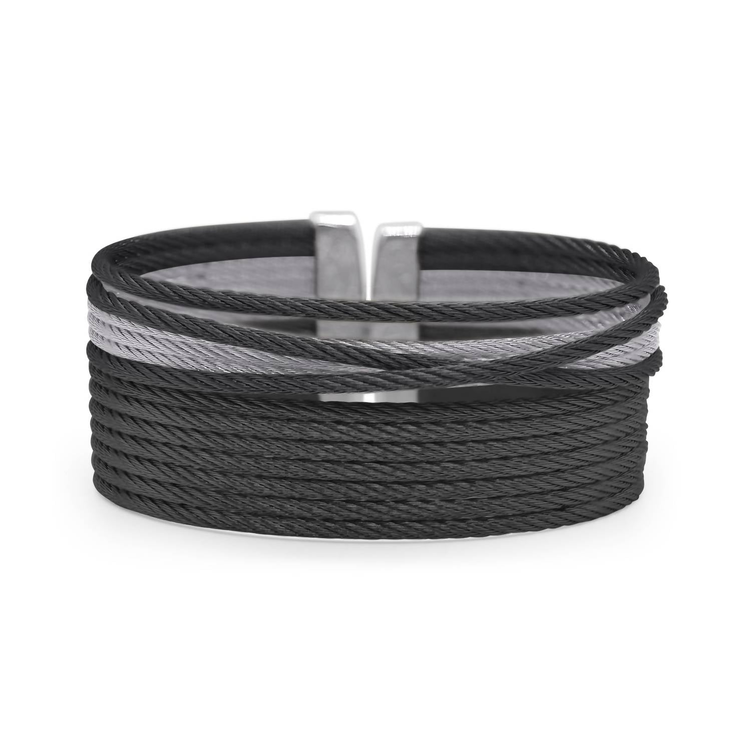 This bracelet will be your favorite go-to piece of the season. Introducing the Openwork Cuff by ALOR, an exquisite piece that exudes contemporary elegance in black and grey. This large cuff bracelet features a distinctive multi-cable design with an overlapping open structure. Crafted from premium stainless steel, it ensures durability and timeless appeal. Imported and perfect for adding a bold statement to any outfit.