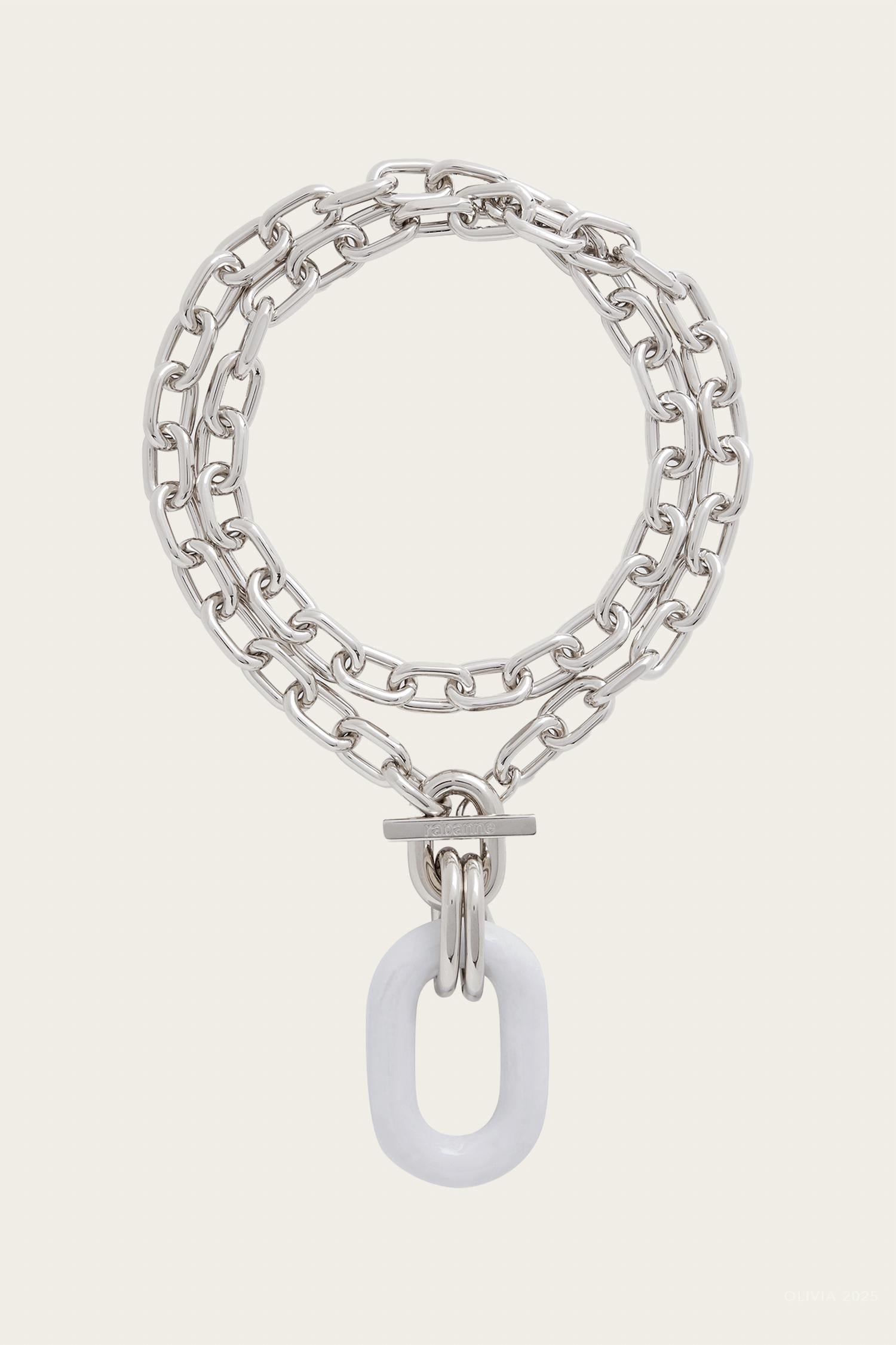 Both understated and impactful, you'll be reaching for this one-of-a-kind necklace season after season. Elevate your jewelry collection with the Women's Double XL Link Chain Necklace by Rabanne, a stunning piece in elegant silver and white. This fine necklace showcases a toggle clasp, crafted with 80% brass and 20% ceramic, and enhanced with luxurious silver plating. Made in Italy, this piece exemplifies exceptional Italian craftsmanship.