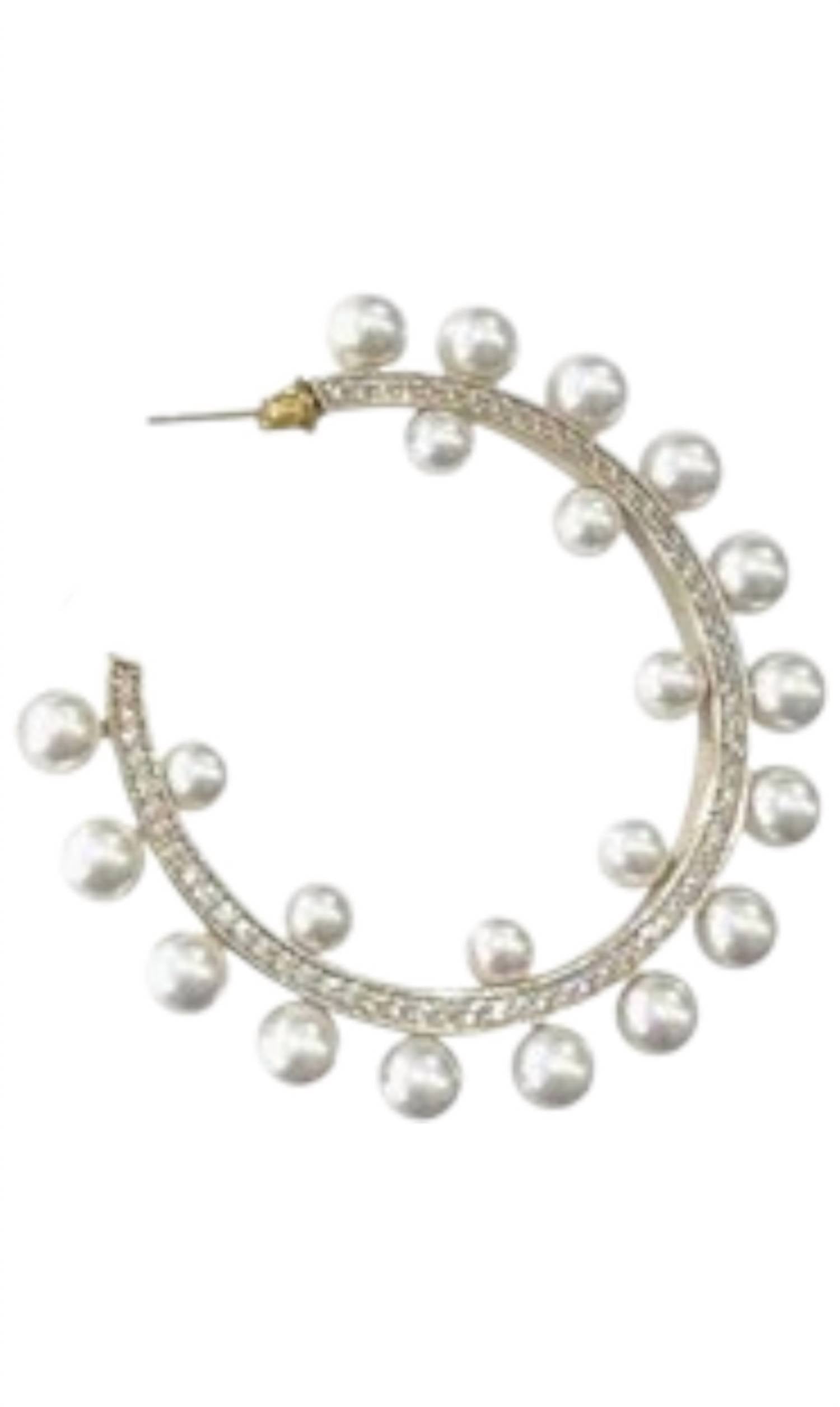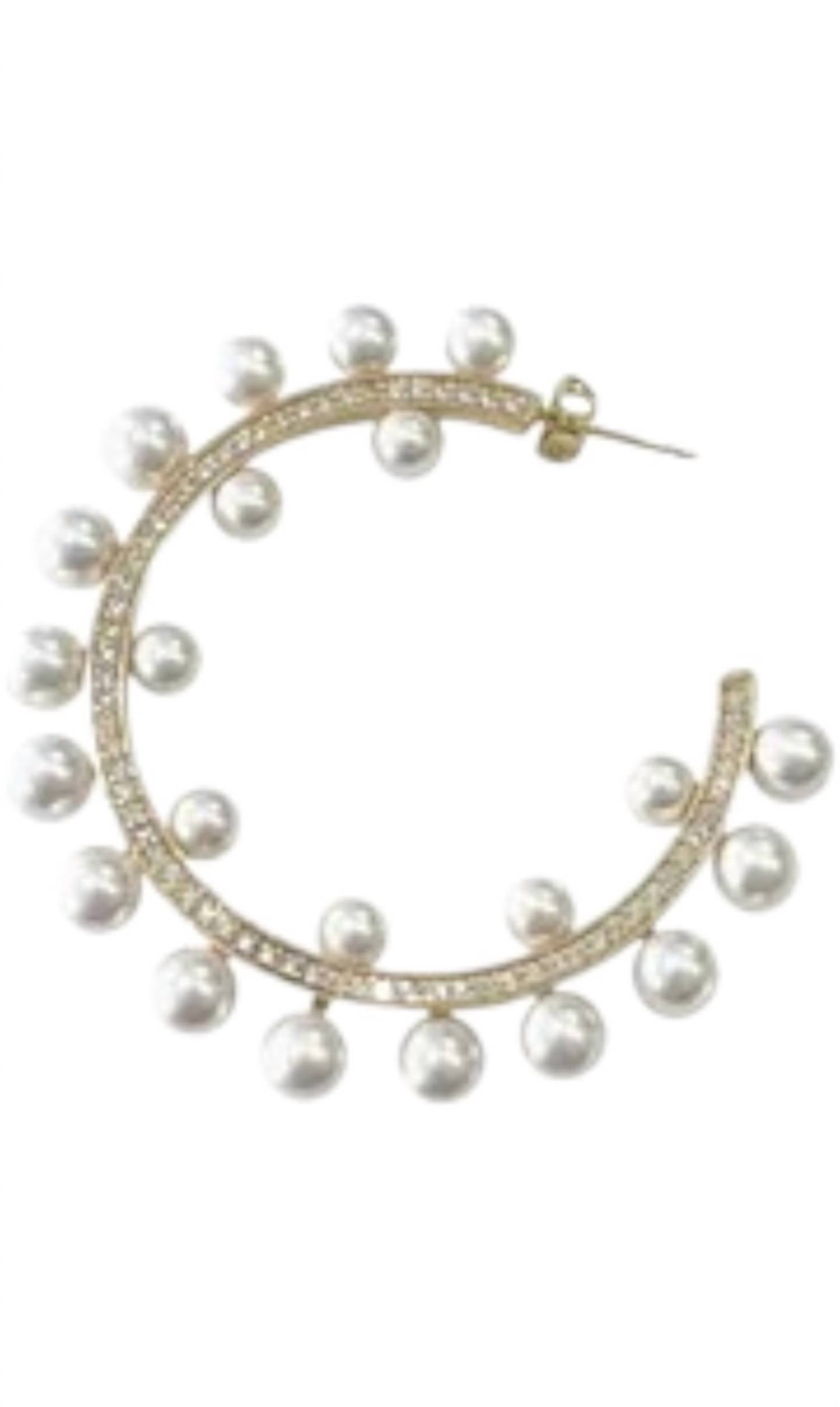eye-catching earrings for every occasion. Introducing the Pearl Sparkle Hoop Earrings by Gemelli, a stunning accessory that combines elegance and modernity. Made from 18k gold-plated material, these hoops are adorned with faux pearl details, adding a touch of sophistication to any ensemble. At 2 inches in length, these goldtone earrings fit comfortably while making a statement. Perfect for elevating any look with a hint of fine jewelry allure.