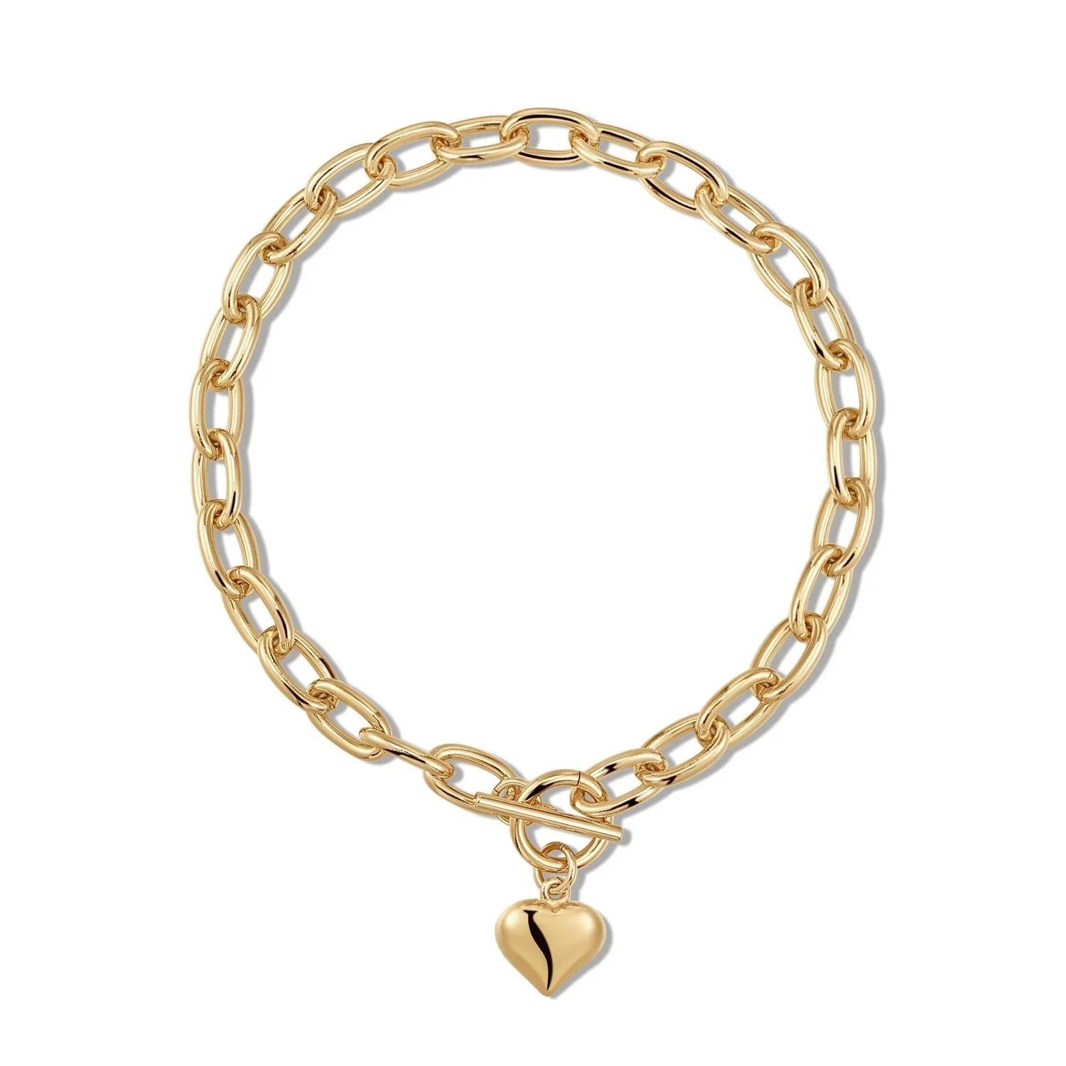 Both understated and impactful, you'll be reaching for this one-of-a-kind necklace season after season. Standout accessory available in radiant 14K Gold. Crafted from sustainable recycled brass. Boasts a bold, thick, rounded link chain with a secure toggle clasp. The captivating 3D solid puffy heart charm measures 0.75 inches, while the chain links offer dimensions of 20mm in length, 12mm in width, and 3mm in thickness. Proudly handcrafted in US. Features a protective coating for enhanced durability.