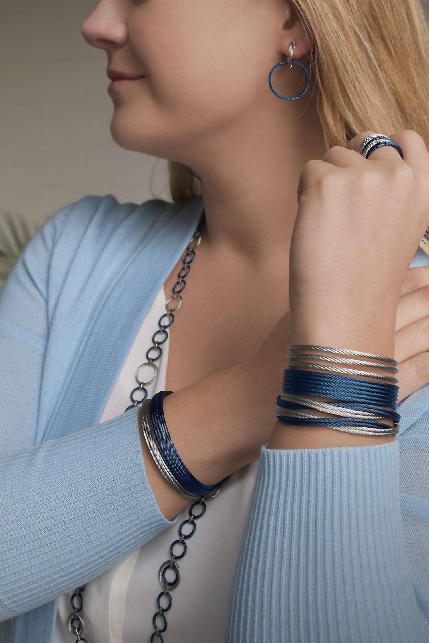 Classic earrings that will take you from season to season. Introducing the Petite Double Drop Earring by ALOR, a chic addition to your jewelry collection in striking Blueberry & Grey. These fashion earrings feature a unique design with one open circle of cable hanging from a cable hoop. Constructed from durable stainless steel, with stainless steel butterfly backs. Imported for quality, these earrings offer a sophisticated touch to any ensemble.