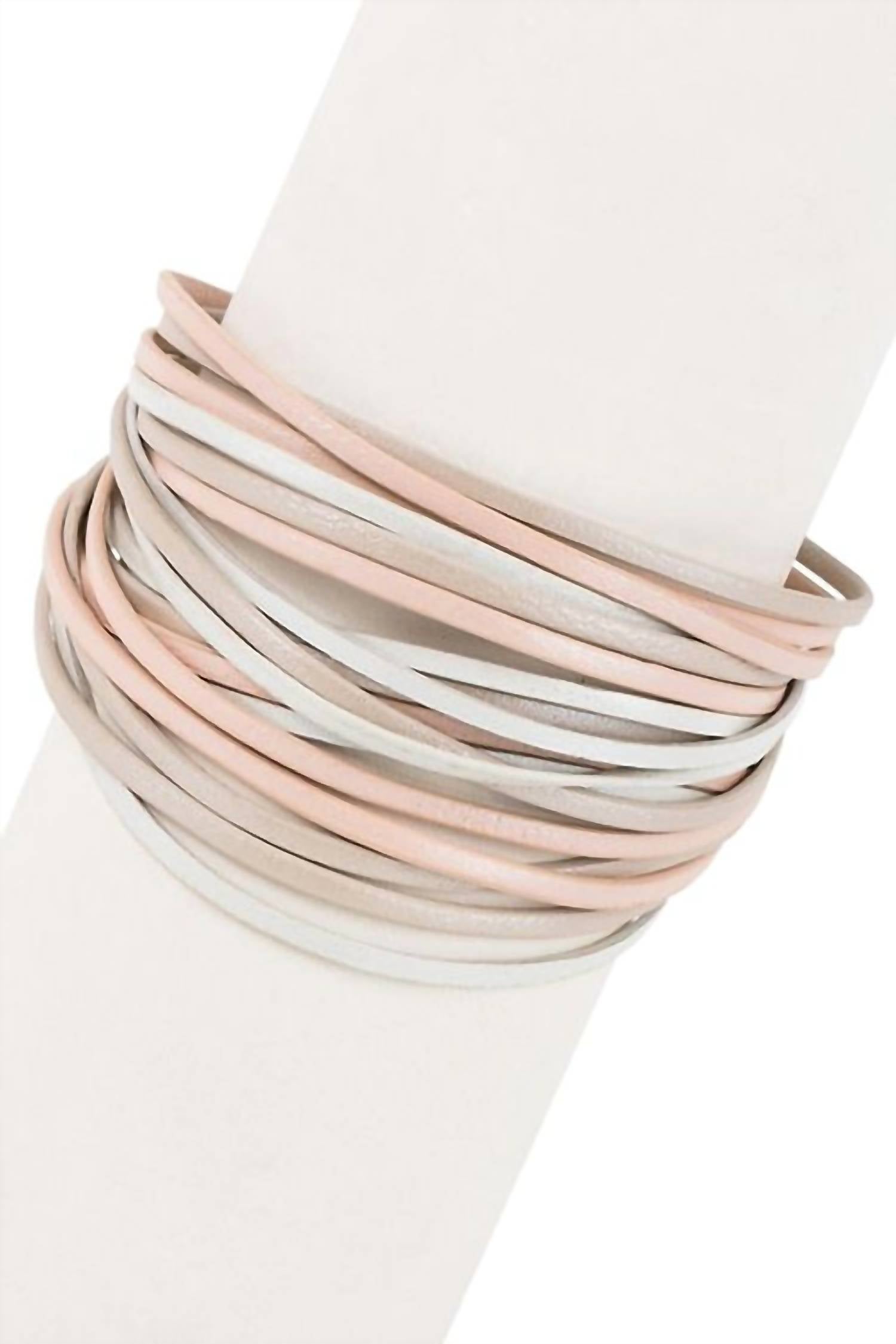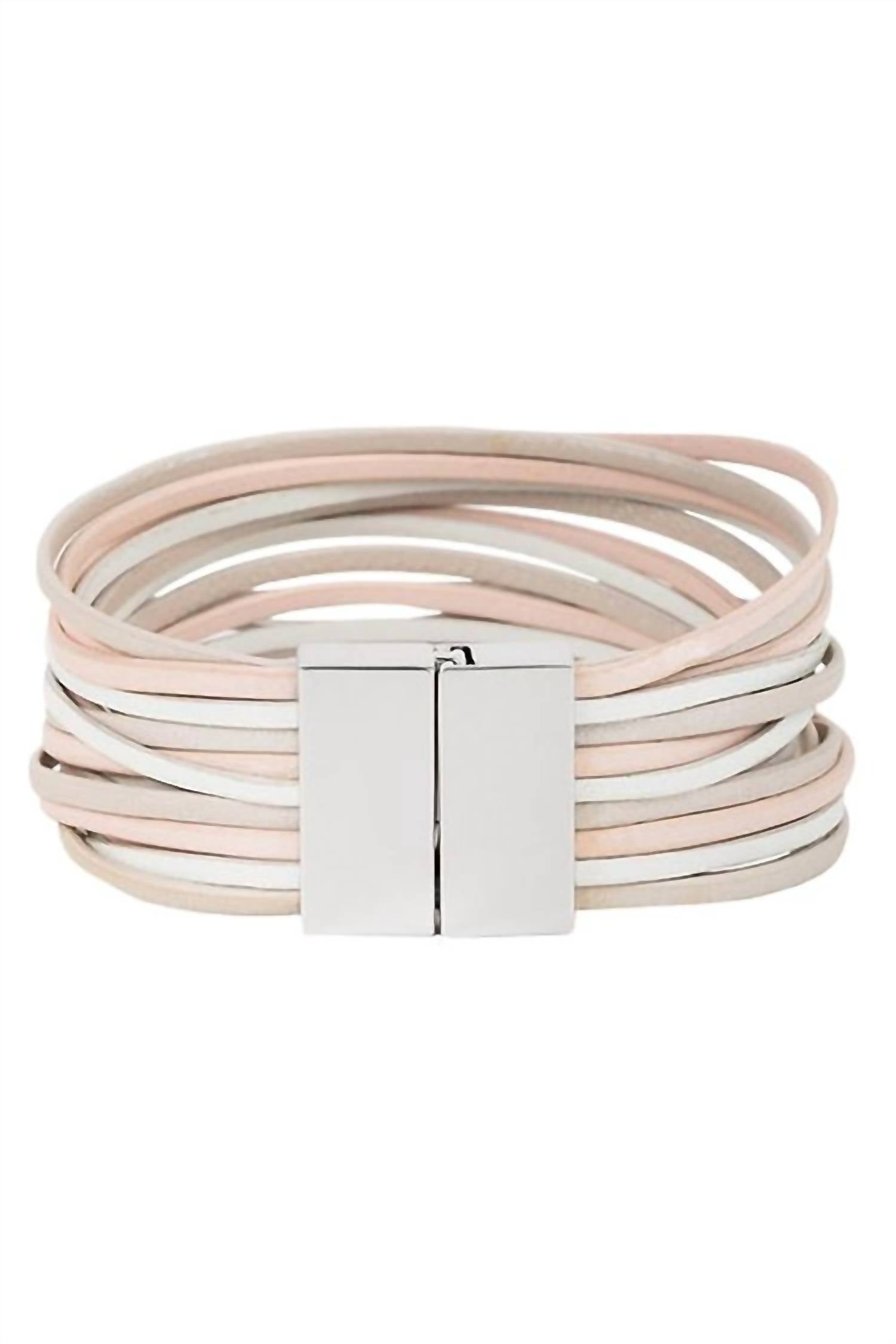 This stand-out bracelet is good enough to wear on its own, or stacked with your favorites. Introducing the Jolie Metallic Leather Bracelet by Saachi, a chic accessory to elevate your fashion ensemble. This lightweight bracelet combines thin strands of neutral-colored leather with a slight metallic finish, offering a subtle sheen that complements any outfit. Crafted from mixed metal, it is designed to be a stylish, on-trend addition to any occasion. Available in a versatile white color, it effortlessly adds a unique layered touch to your look.