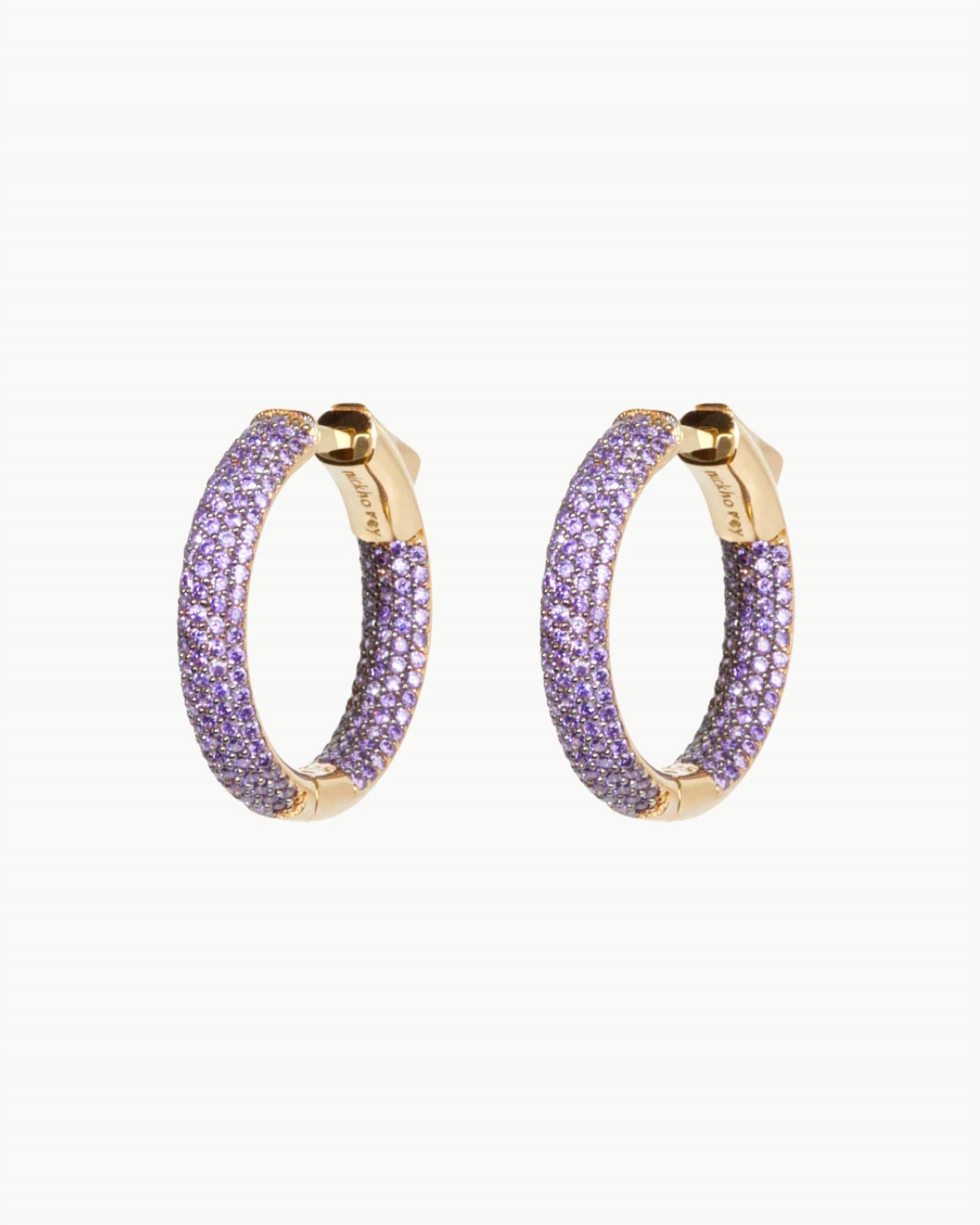 Easy and elegant earrings to complement any outfit. Elevate your ensemble with the Women's Mini Tire Hoop Earrings by Nickho Rey, where elegant meets edgy in a stunning 19.05mm design. Crafted from 14k Gold Vermeil and adorned with vibrant purple crystals, these earrings are perfect for both day and night occasions. Their dainty size offers a versatile and luxurious statement, ensuring your fashion remains on trend.