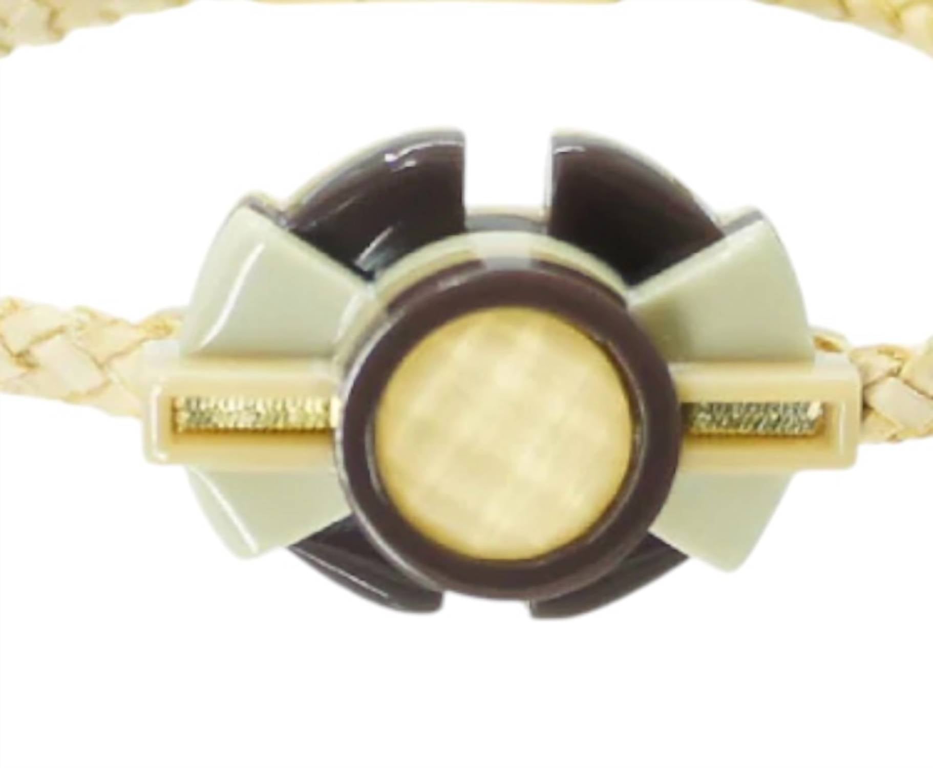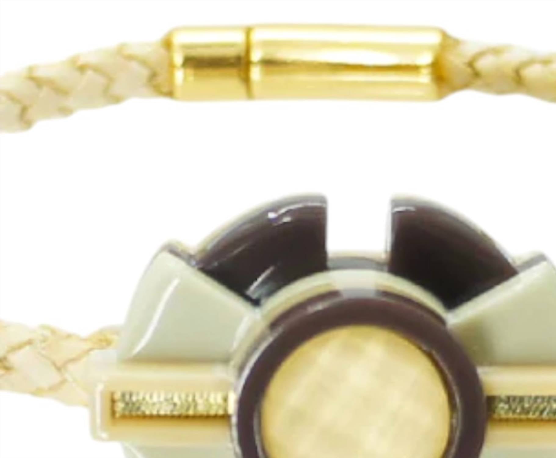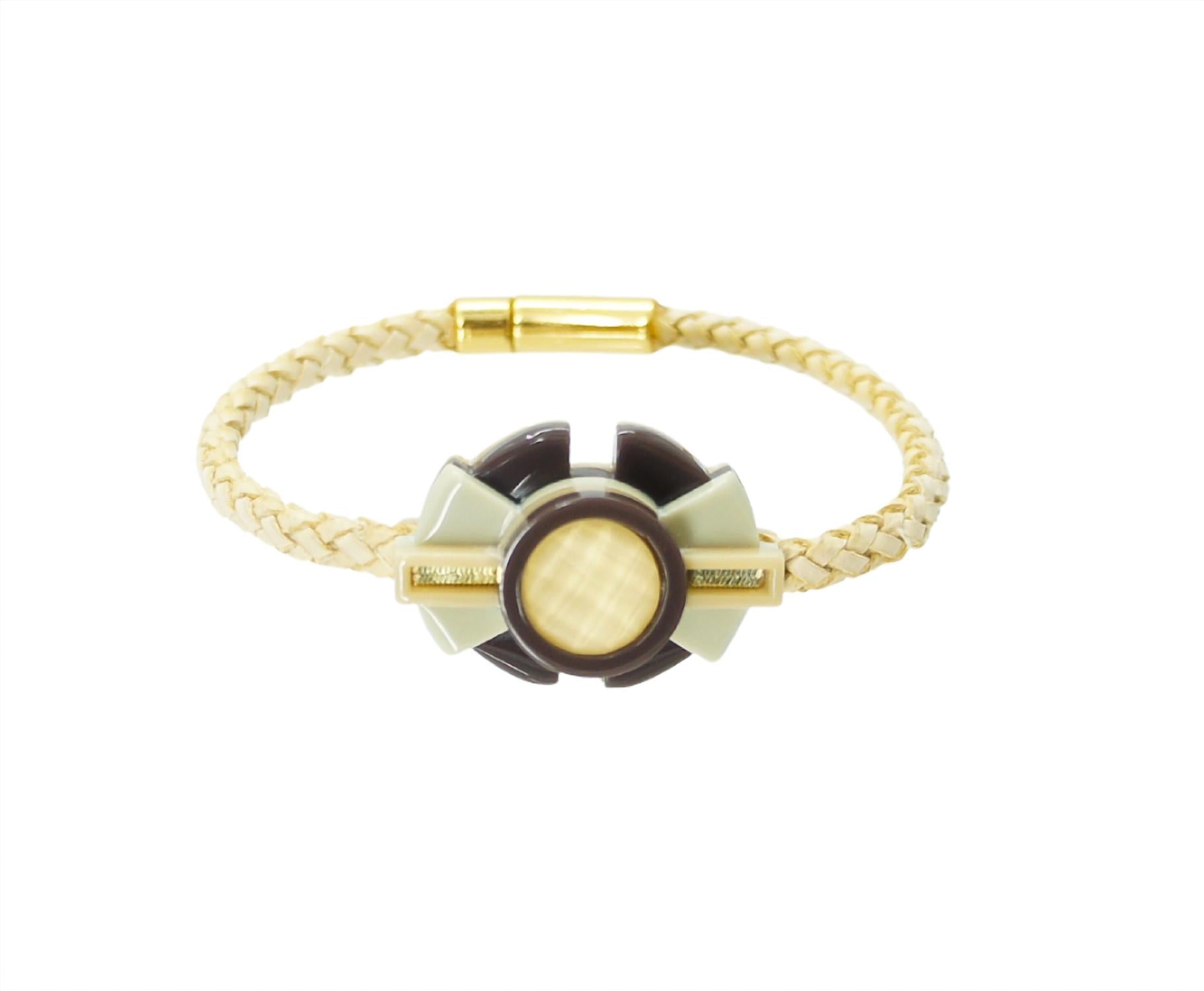 This Oca Bracelet combines acrylic, braided leather, and a glass stone with a golden brass chain and magnet clasp. Handmade in Brazil, it offers a secure fit and standout design.