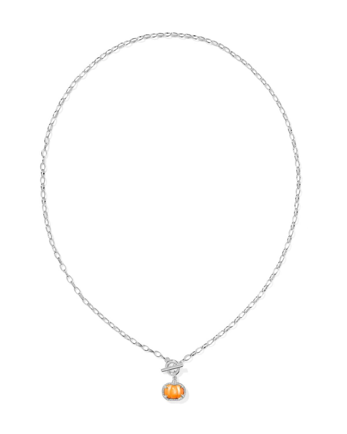 Both understated and impactful, you'll be reaching for this one-of-a-kind necklace season after season. Embrace the spirit of fall with the Women's Pumpkin Link And Chain Necklace by Kendra Scott. This delightful piece showcases a playful pumpkin-shaped charm crafted from Silver Orange Mother of Pearl, suspended on a 17" paperclip chain. The necklace is elegantly finished with a toggle clasp, ensuring both style and ease of wear. Material: Silver Plating with Mother of Pearl simulant stone. Dimensions: 17" chain, 0.46"L x 0.44"W pendant.
