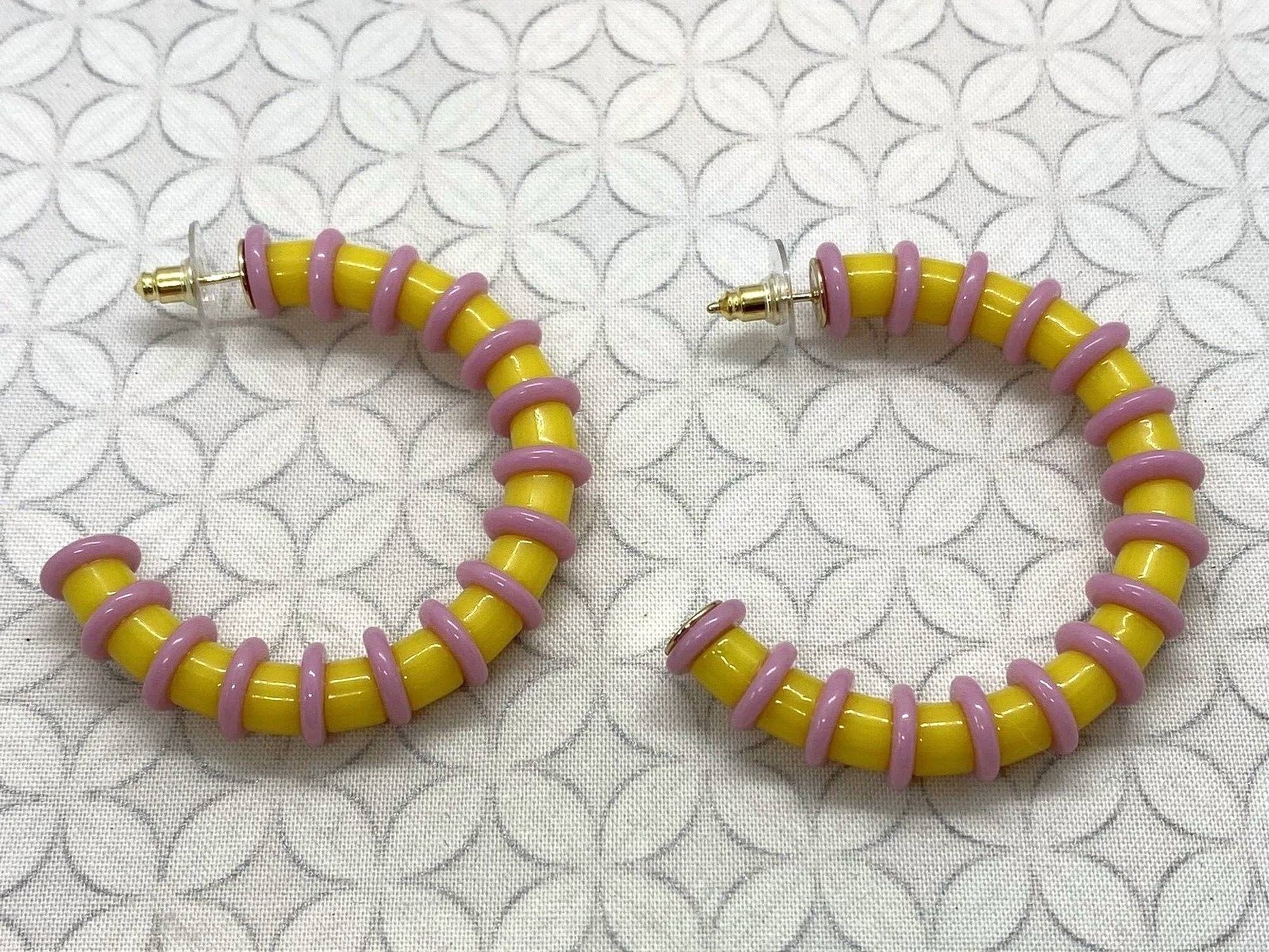 Easy and elegant earrings to complement any outfit. Introducing the vibrant Women's Gallery Beaded Hoop Earrings by Lele Sadoughi, crafted to make a statement in Canary Yellow. These earrings are designed in resin with gold plating and secured by a surgical steel post back for comfort. Measuring approximately 2" in diameter, they are an elegant addition to any fashion jewelry collection. Proudly imported, these hoops blend playful colors with sophisticated design.