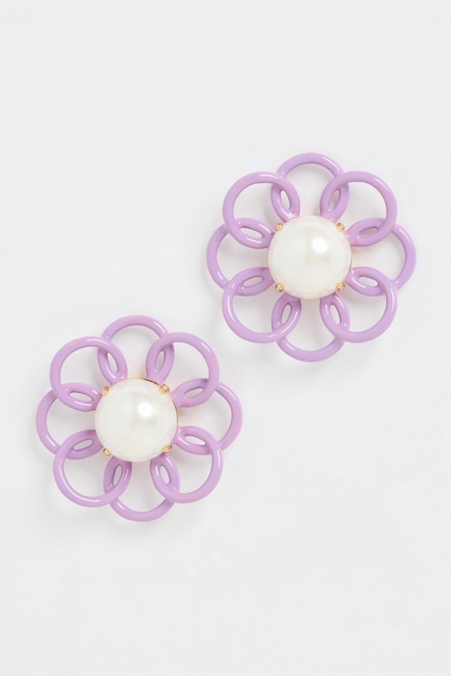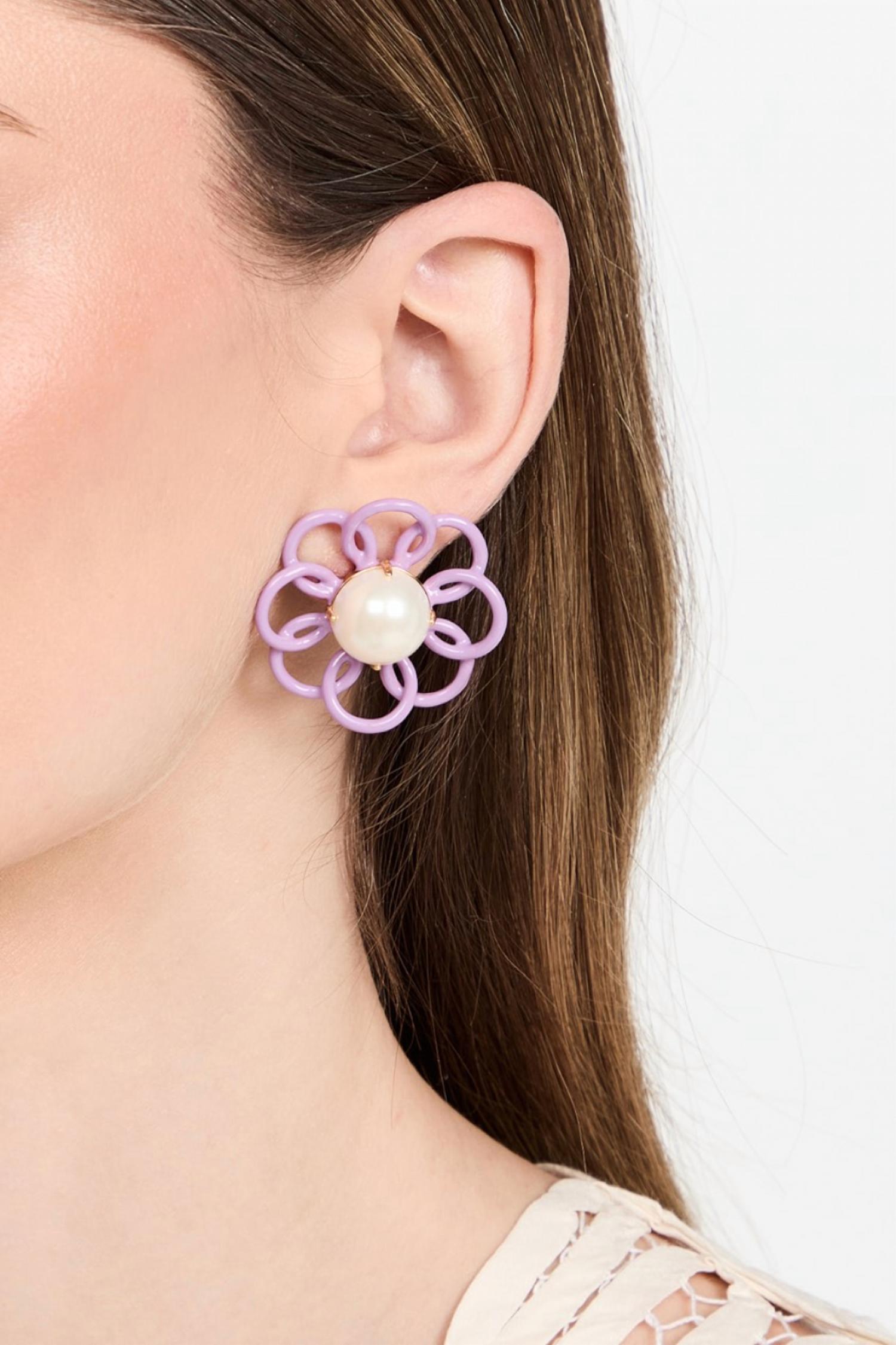 Easy and elegant earrings to complement any outfit. Introducing the Women's Marigold Button Earrings by LELE SADOUGHI, a chic expression of floral elegance in lilac. These earrings showcase enamel-coated petals with a faux pearl center, all plated in 14k gold. Made from brass with a reliable steel post closure, they measure 1.25 inches in diameter. Imported from China, these fashion earrings seamlessly blend style and sophistication.