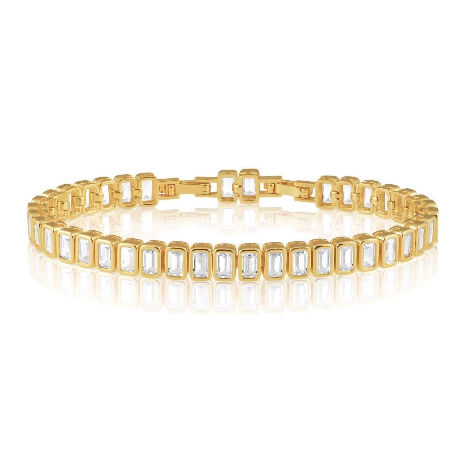 This stand-out bracelet is good enough to wear on its own, or stacked with your favorites. The Women's Ella Tennis Bracelet by Sahira Jewelry Design is a stunning piece that combines elegance and durability. Featuring a beautiful pattern of rectangle cubic zirconia stones set in exquisite 18k yellow gold plating, this bracelet adjusts from 6.5" to 7.5" to ensure a perfect fit. Finished with an adjustable extra clasp, it's both water and tarnish resistant, promising long-lasting wear. This fine gold bracelet is ideal for those seeking sophistication in their accessory collection.