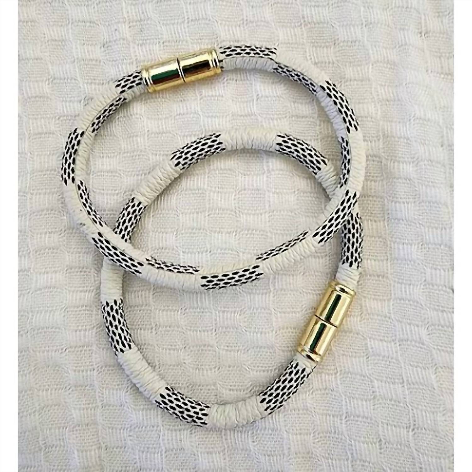 This bracelet will be your favorite go-to piece of the season. Introducing the chic Women's Checkered Magnetic Clasp Statement Bracelet by Dani & Em, an essential addition to your accessory collection. This bracelet features a sophisticated checkered design in classic black and white, crafted from lightweight faux leather for comfortable wear. It is finished with a sleek gold magnetic clasp, making it both stylish and practical. Designed as one size fits most, it is perfect for stacking alongside your favorite watch or cable bracelet.