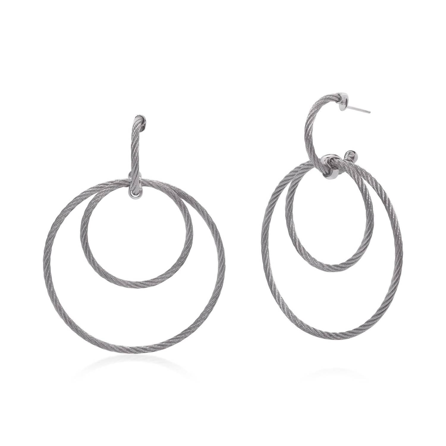 eye-catching earrings for every occasion. Introducing the ALOR Triple Drop Hoop Earring, a stunning fine jewelry piece that effortlessly blends elegance and modern design. Crafted with sleek stainless steel cable and accented by 18kt gold posts, these earrings feature two open circles hanging gracefully from a cable hoop. Closure: Secure with stainless steel butterfly backs. Imported for the finest quality.