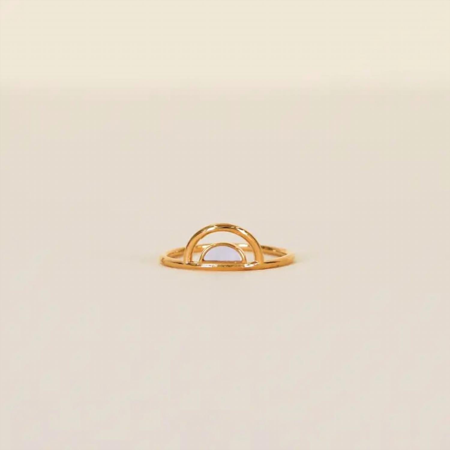 The wear-everywhere ring that you won't want to take off. Stunning piece in radiant gold. Features a delicate half moon Mother of Pearl stone nestled under a gold arch. Embodying elegance and sophistication. Made from brass with a protective coating. Offers tarnish-free, long-lasting wear with 5x more gold than standard 18k gold plating. Enjoy hypoallergenic, lead-free wear, ensuring comfort for sensitive skin.