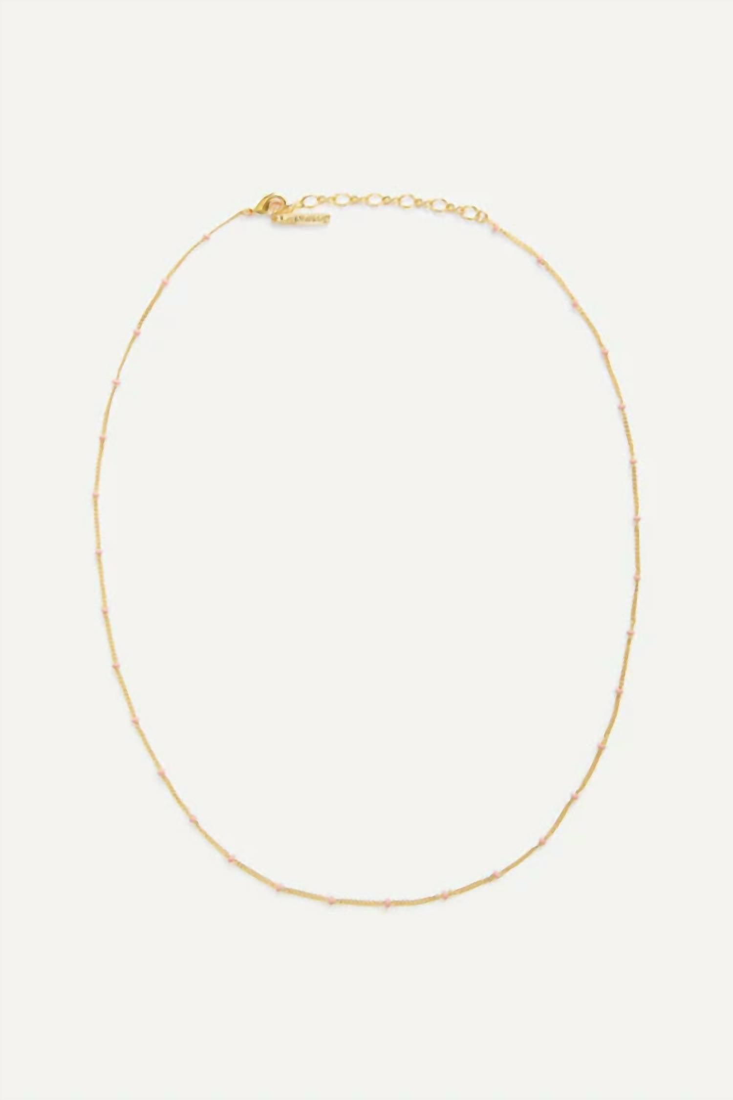 Layer this necklace or wear it on its own. Either way it's a win-win. Introducing the Enamelled Golden Chain Pink Beads Necklace by Les Nereides, a stunning accessory that exudes elegance in every detail. This fashion necklace features an enamelled gold-plated brass chain adorned with delicate pink beads, perfect for adding a touch of sophistication to any outfit. Personalize your style by adding your favorite pendant or charm to this versatile piece. Crafted with precision, it incorporates simulant stones for an exquisite finish.