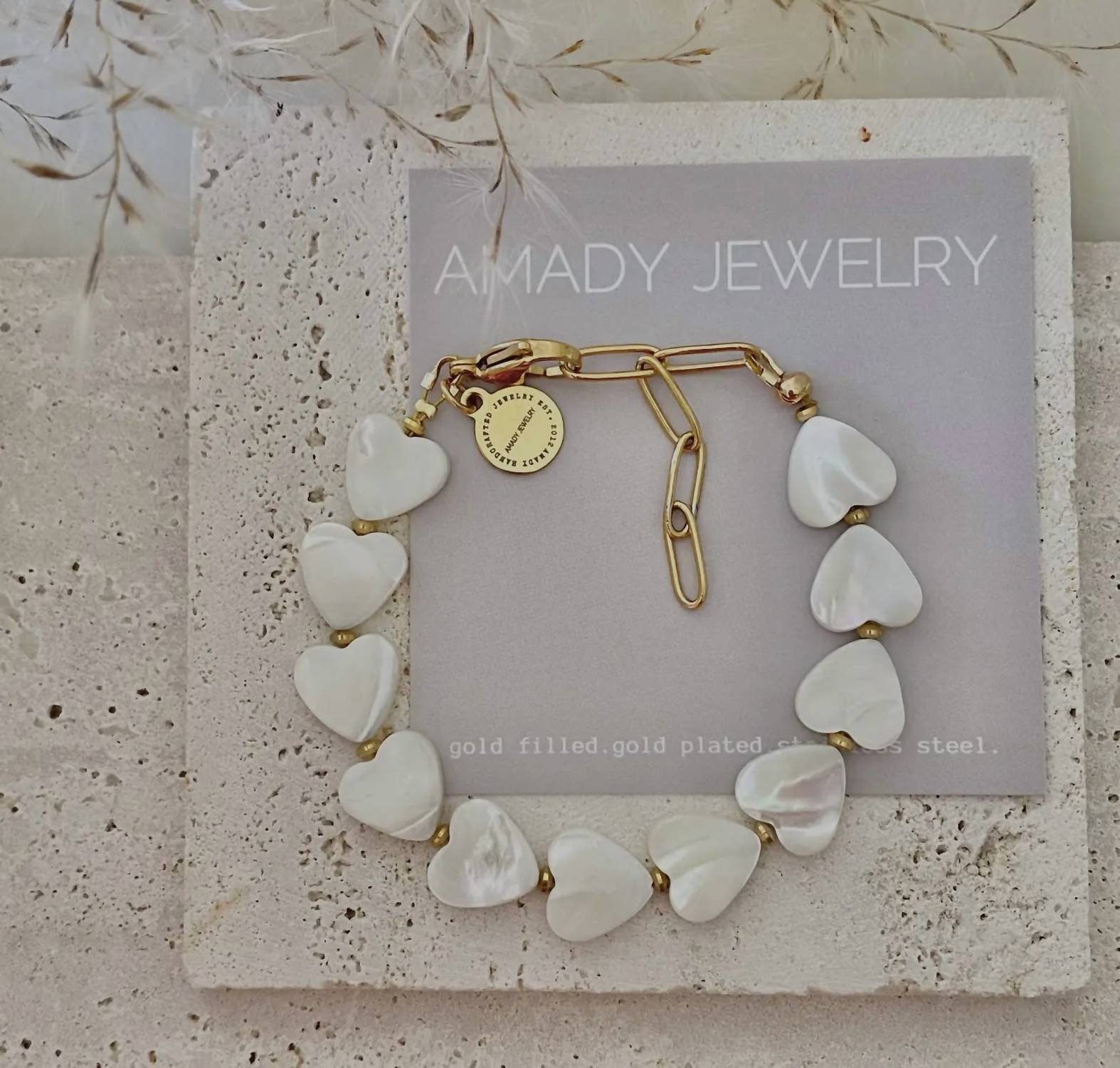 Stacked or solo - you can't go wrong with this bracelet. Enhance your accessory collection with the Women's Heart Shell Bracelet by Amady Jewelry, featuring genuine pearl shell heart beads. This elegant piece, measuring 6.5" with an additional 2" extension, is crafted with 18K gold-plated stainless steel components, ensuring style and durability. Proudly made in the United States, this bracelet is not only water-resistant but also hypoallergenic, making it ideal for sensitive skin. Enjoy wearing a piece that's lead and nickel free for added peace of mind.