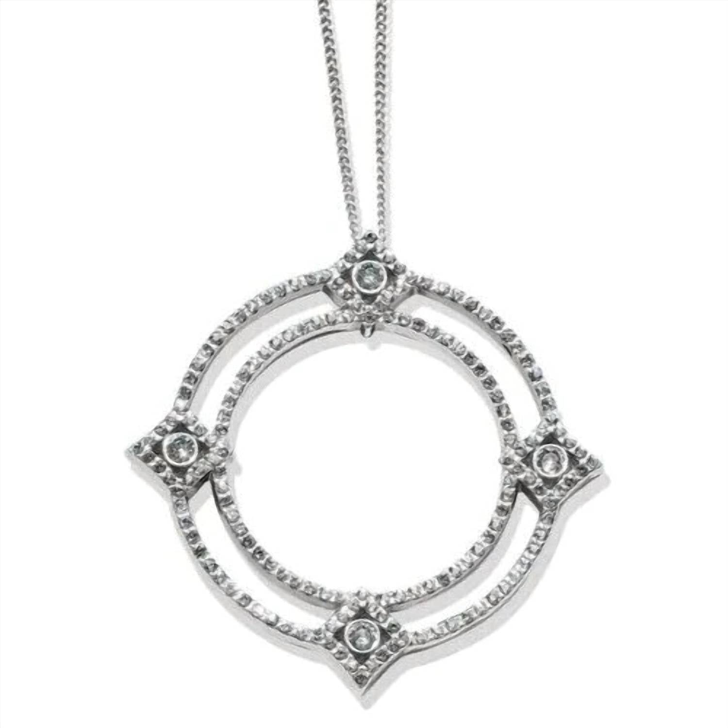 Layer this necklace or wear it on its own. Either way it's a win-win. Discover the Brighton Women's Illumina Diamond Ring Necklace, a refined piece inspired by light dancing through mirrored glass. This versatile necklace can elevate both dressy and casual outfits with its silver-plated finish and dazzling crystal material. The necklace offers a length adjustable from 18 to 20 inches and features a 1 5/8-inch pendant drop. Lobster claw.