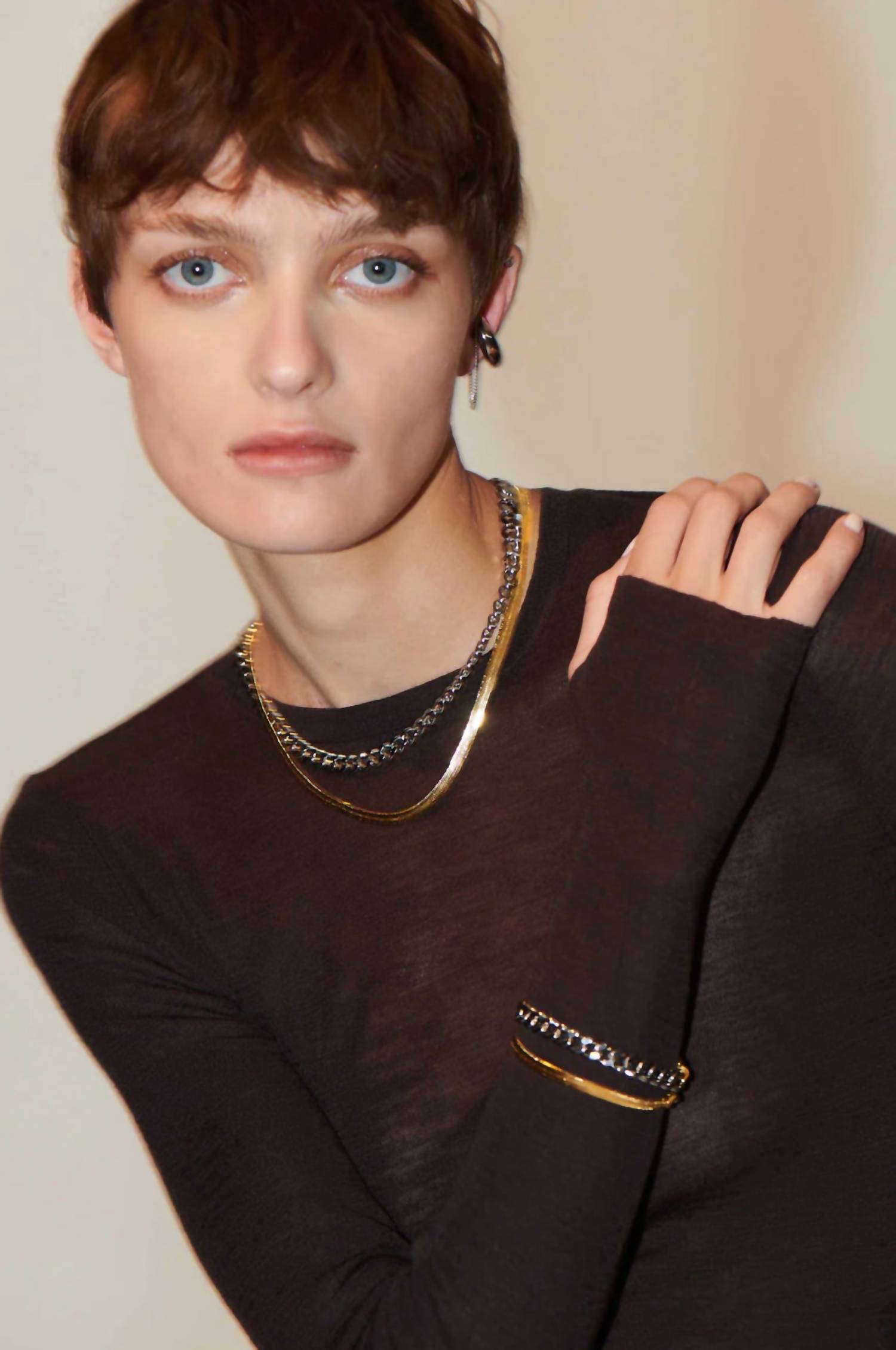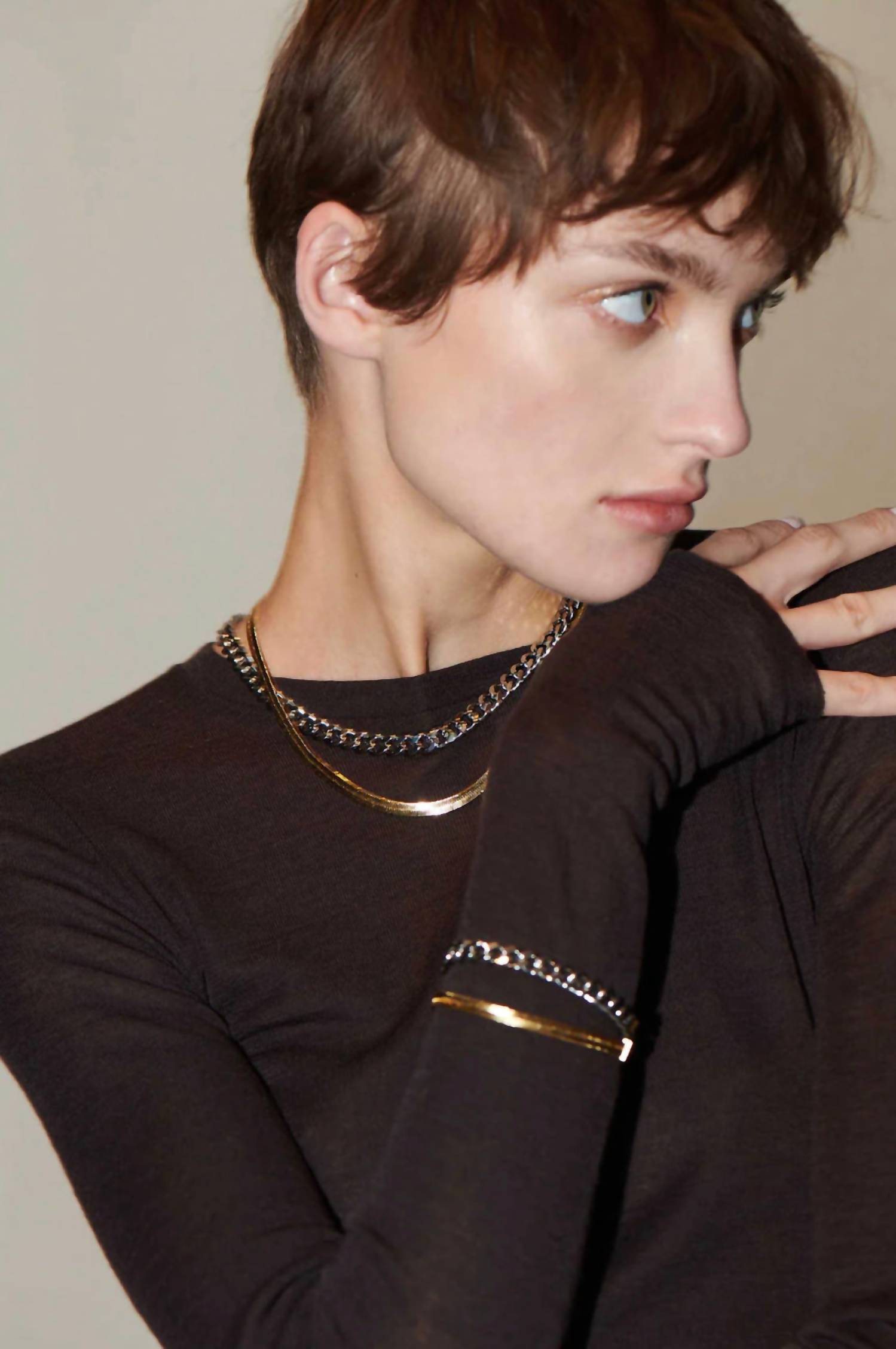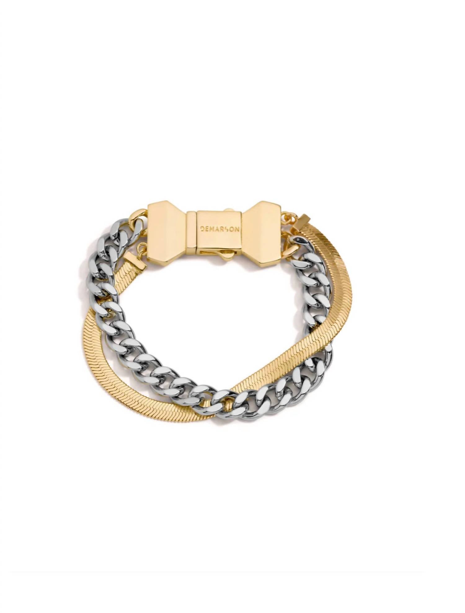 This bracelet will be your favorite go-to piece of the season. Elevate your accessory game with the Women's Nadine Bracelet by Demarson, a stunning fusion of 12k gold and shiny silver tones. This fashion bracelet boasts a bold design with layered herringbone and curb chain details, perfectly captured in a 7" length. Crafted from brass and featuring a signature logo engraved closure, it adds a touch of sophistication to any outfit. Imported and includes one custom pouch for storage.