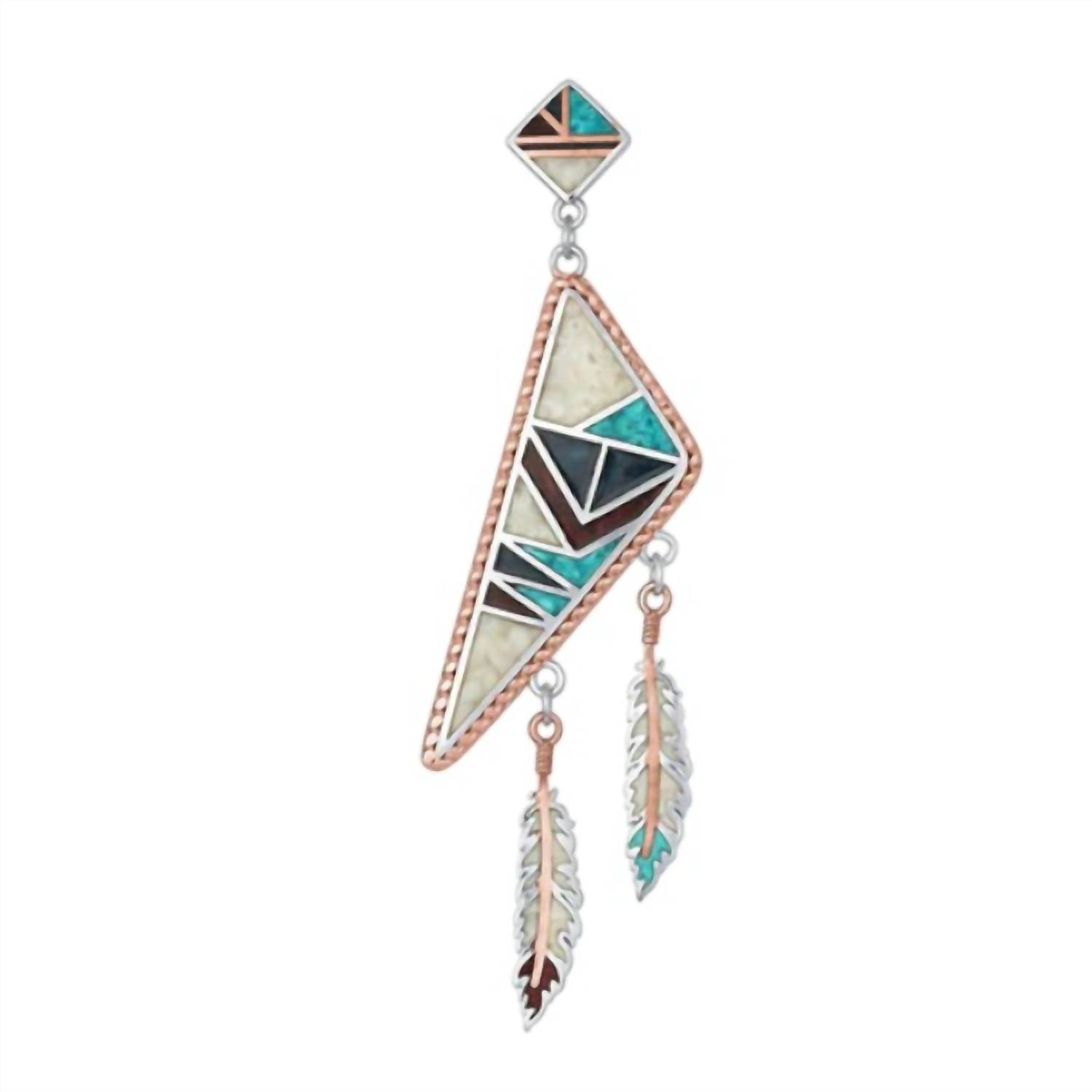 eye-catching earrings for every occasion. Discover the ornate elegance of the Women's American Legend Ceremony Earrings by Montana Silversmiths, inspired by traditional dreamcatchers for a unique touch. These intricate earrings feature diamond-shaped studs with secure stainless steel post backs, gracefully suspending an irregular triangle design with rose gold rope detailing. The earrings are adorned with a vibrant mix of turquoise, ruby, forest green, and green stones, complemented by rhodium and rose gold over a brass base. Care for these stunning pieces with a simple wipe of a damp cloth, avoiding chemical or abrasive cleaners to preserve their brilliance.