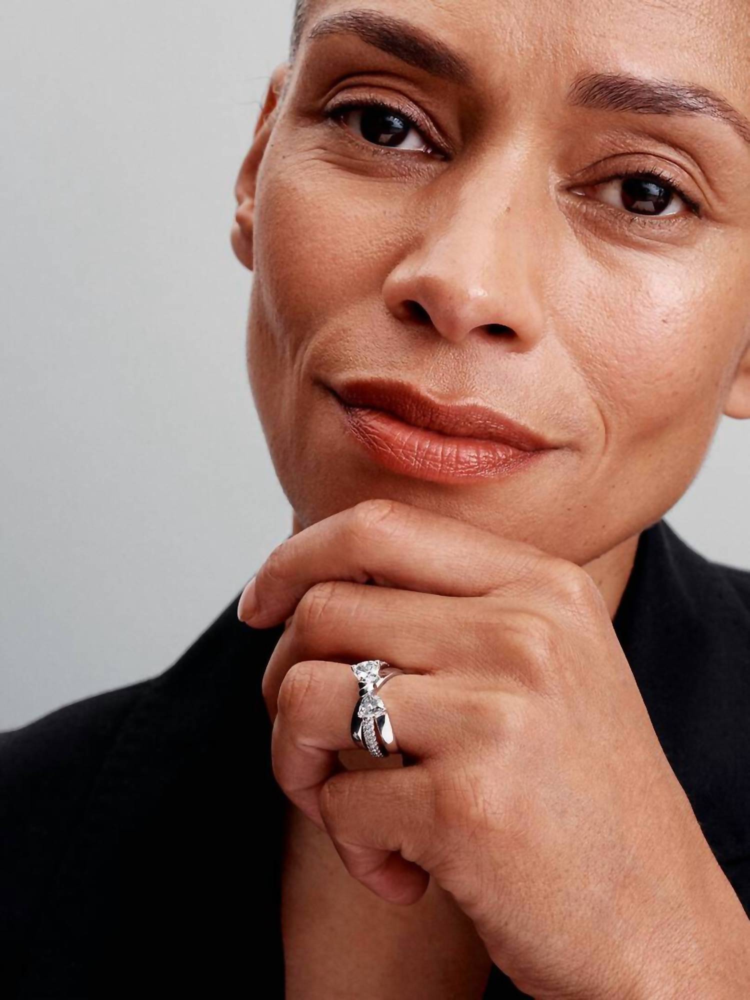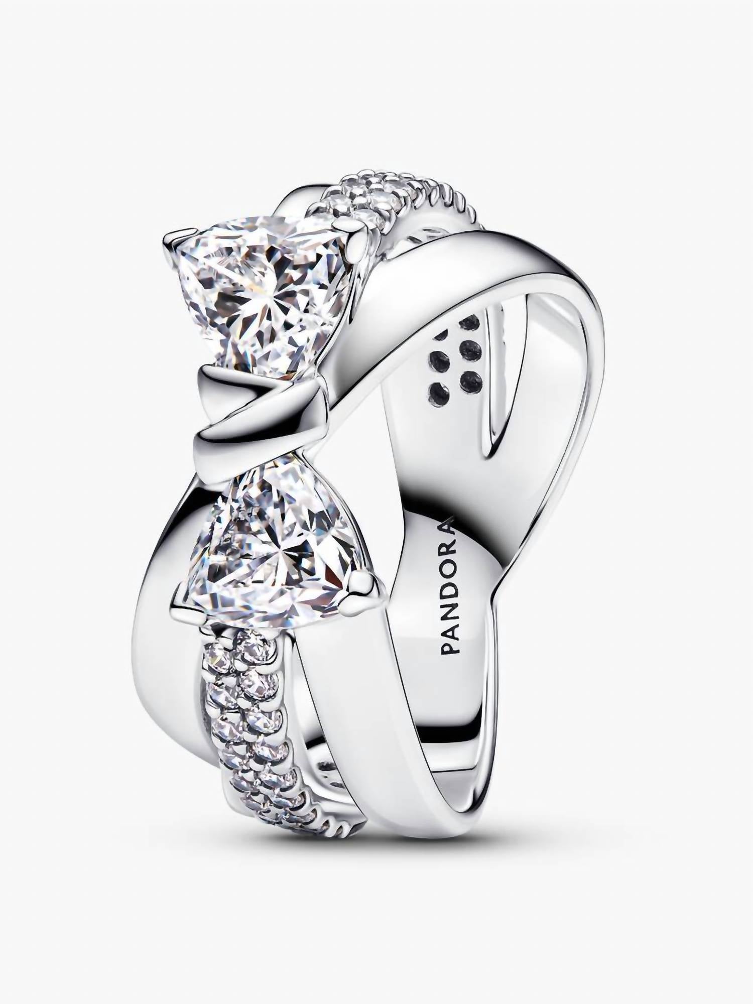The wear-everywhere ring that you won't want to take off. The Sparkling Bow Crossover Ring, crafted in sterling silver, features a bow-shaped motif surrounded by sparkling clear cubic zirconia. The triple band design showcases a row of stones on the mid-line, while the polished outer lines add a touch of shine. Perfect for festive occasions, this ring pairs perfectly with both casual and evening outfits, adding a hint of sparkle to any look. Size 8.5