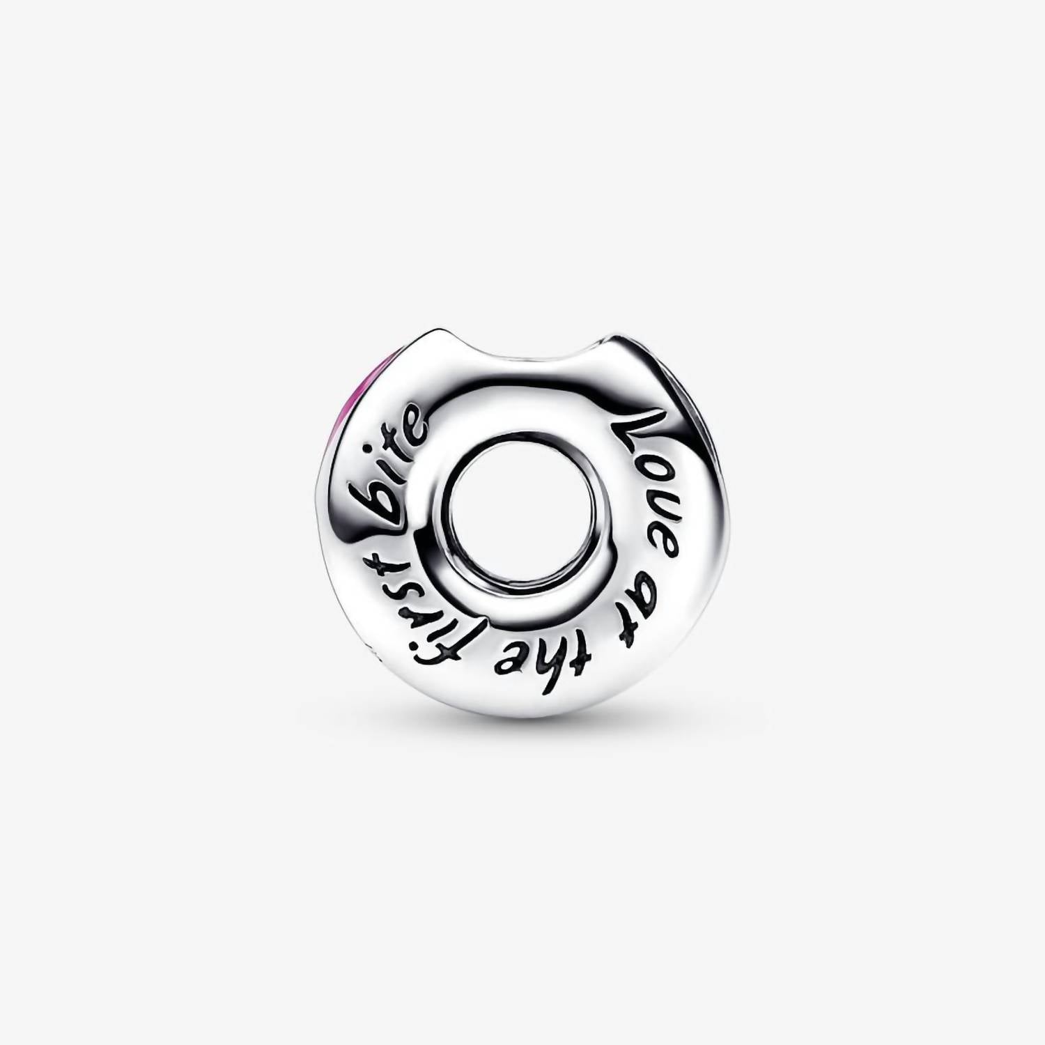 This stand-out bracelet is good enough to wear on its own, or stacked with your favorites. Celebrate your sweetest moments with the Women's Sparkling Sprinkled Donut Charm by Pandora. Expertly crafted from sterling silver, this adorable piece features cubic zirconia stones in clear, pink, and iridescent hues that dazzle with every movement. The charm is adorned with polished silver sprinkles and engraved with the heartfelt message, "Love at the first bite." It's the perfect addition to any Pandora Moments bracelet, offering a charming expression of love and whimsy.
