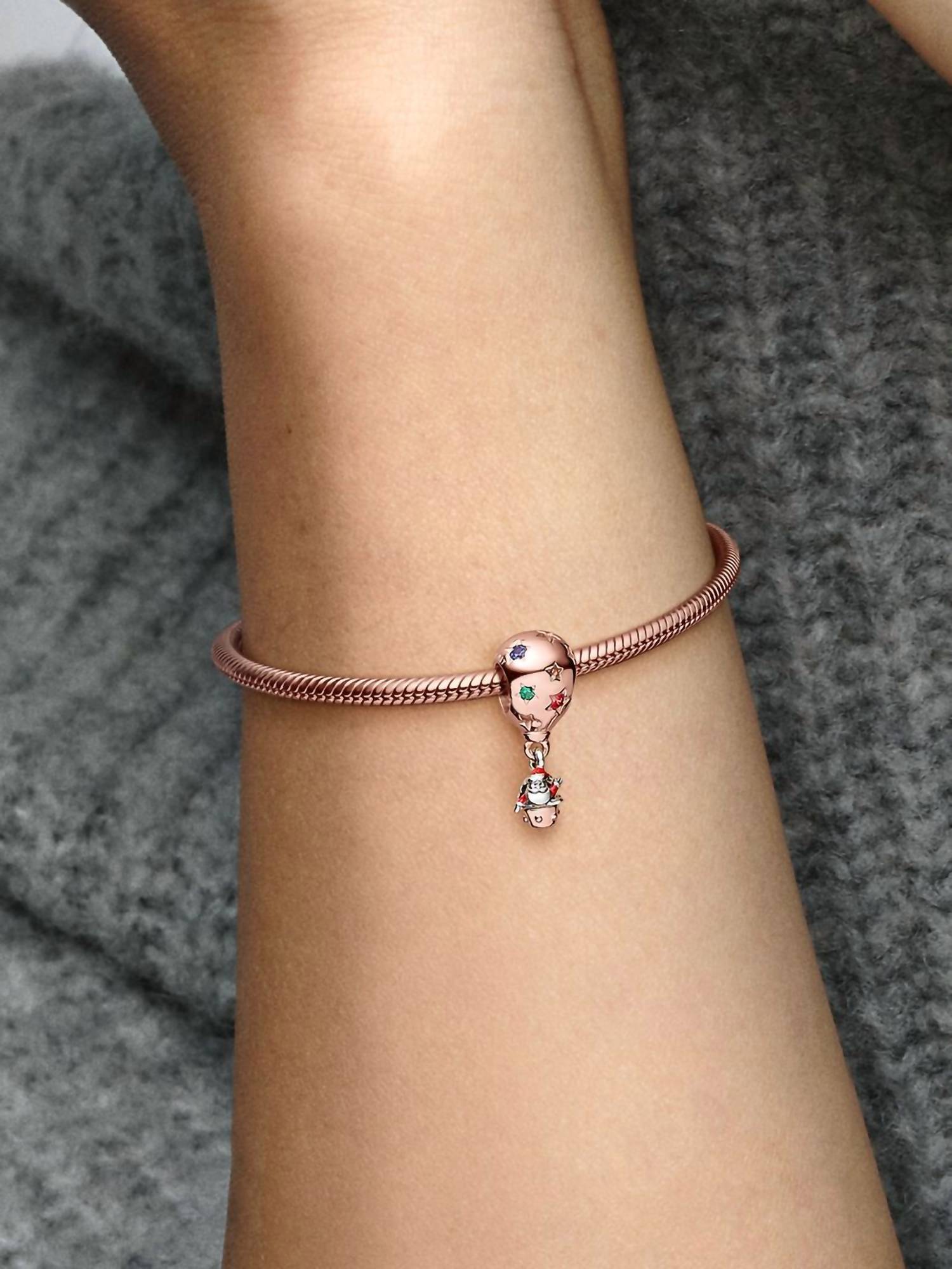 This bracelet will be your favorite go-to piece of the season. Celebrate the holidays with the Women's Two-tone Santa Claus in Hot Air Balloon Charm by Pandora, combining festive spirit with elegant craftsmanship. Made of enduring sterling silver accented with luxurious 14k rose gold plating, this charm brings joy with its enamel detailing and festive-colored stones set in star shapes. This hand-finished piece carries a heartwarming message, "Love peace and joy," perfect for the season. Measuring 8.2mm deep, 19.5mm high, and 7.8mm wide, it's a delightful addition to any holiday outfit.