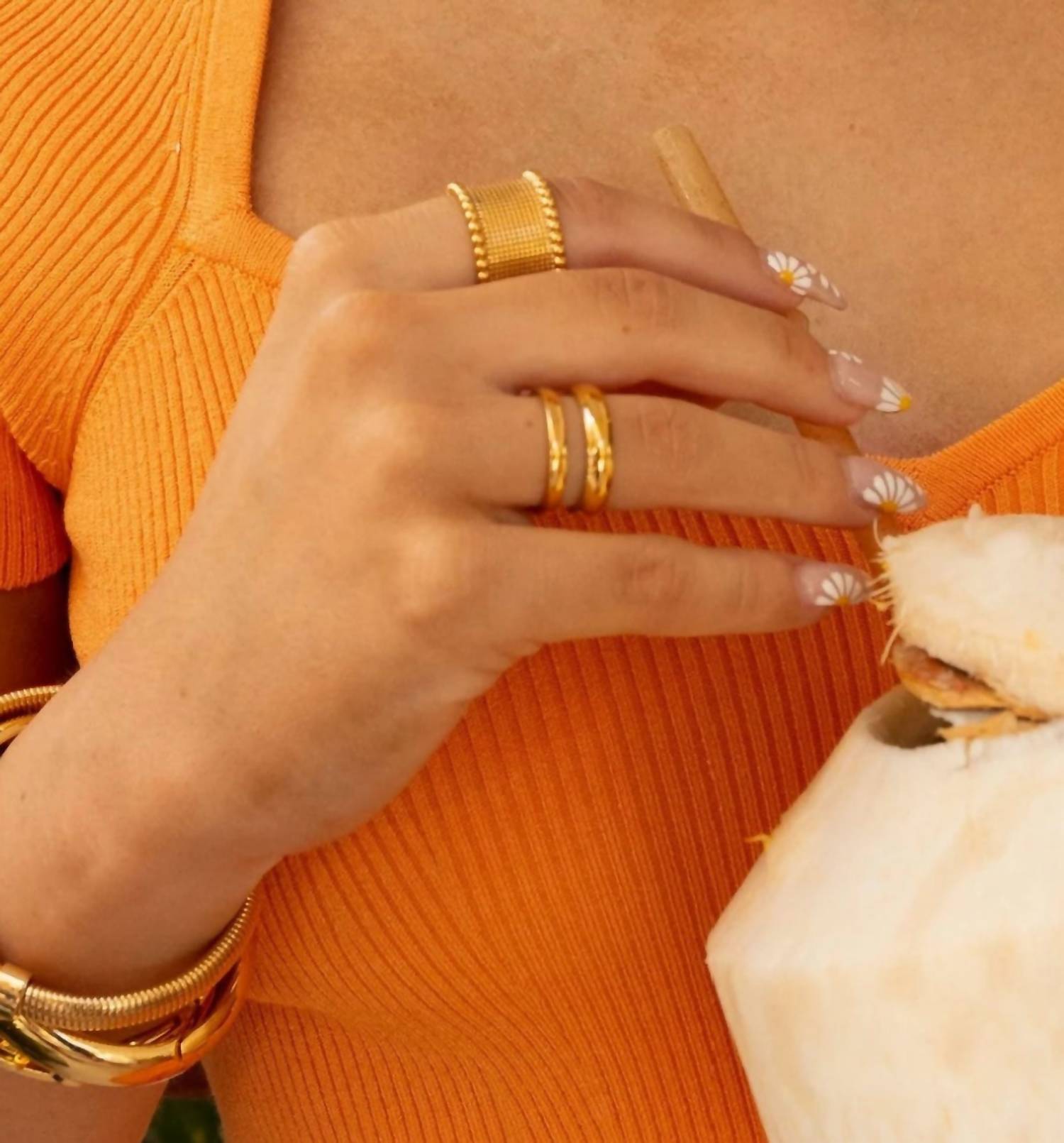 Wear this ring stacked or by itself... you can't go wrong. Enhance your ring collection with the Women's Zuma Ring by SAHIRA, an exquisite addition perfect for everyday elegance. This 18k gold-plated ring over stainless steel boasts a stunning double-layered band design, with a width of 10mm, and is water and tarnish resistant for lasting beauty. Its lustrous goldtone finish complements any look effortlessly. The ring is expertly crafted to provide durability and style, and it is recommended to size up due to its thickness.