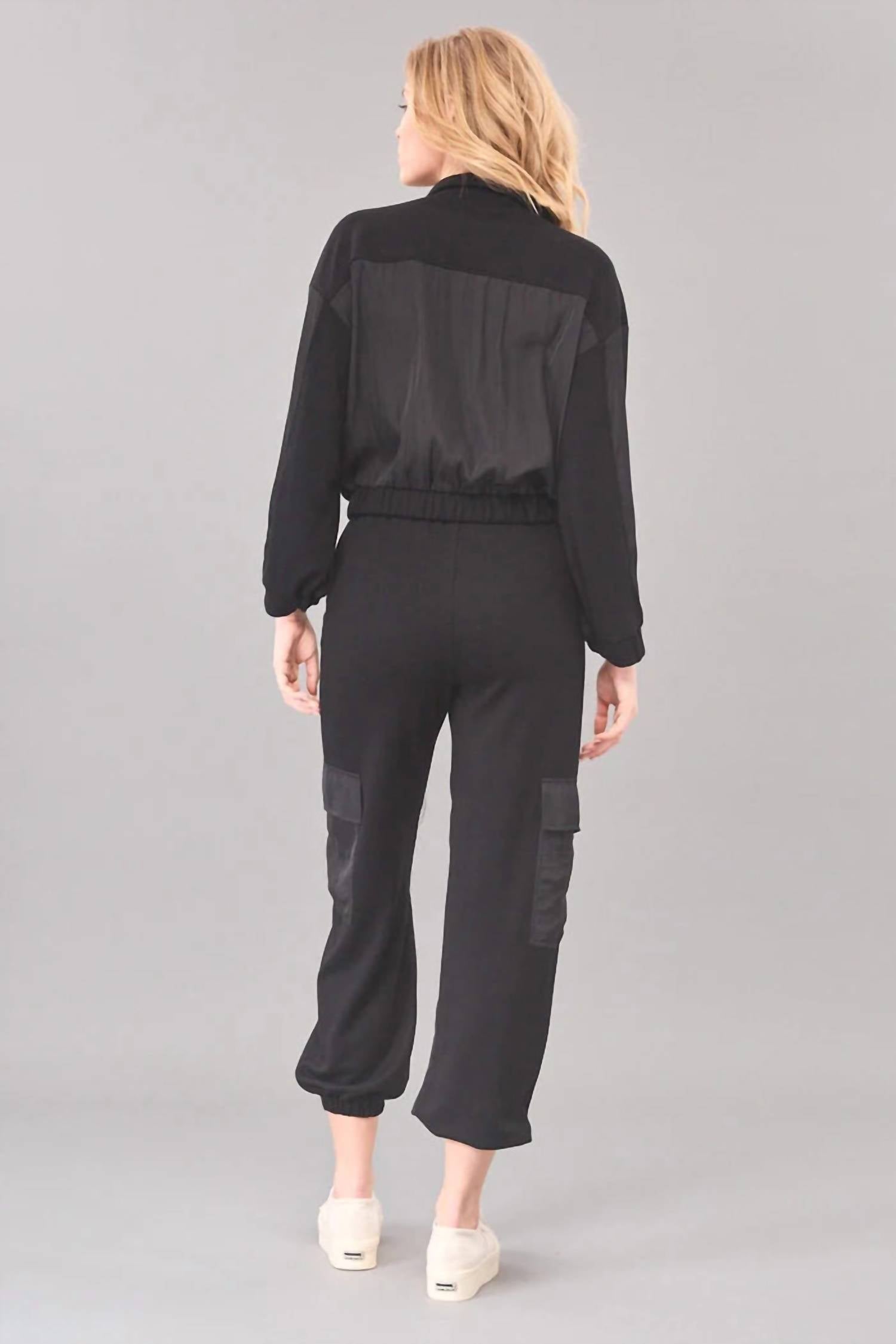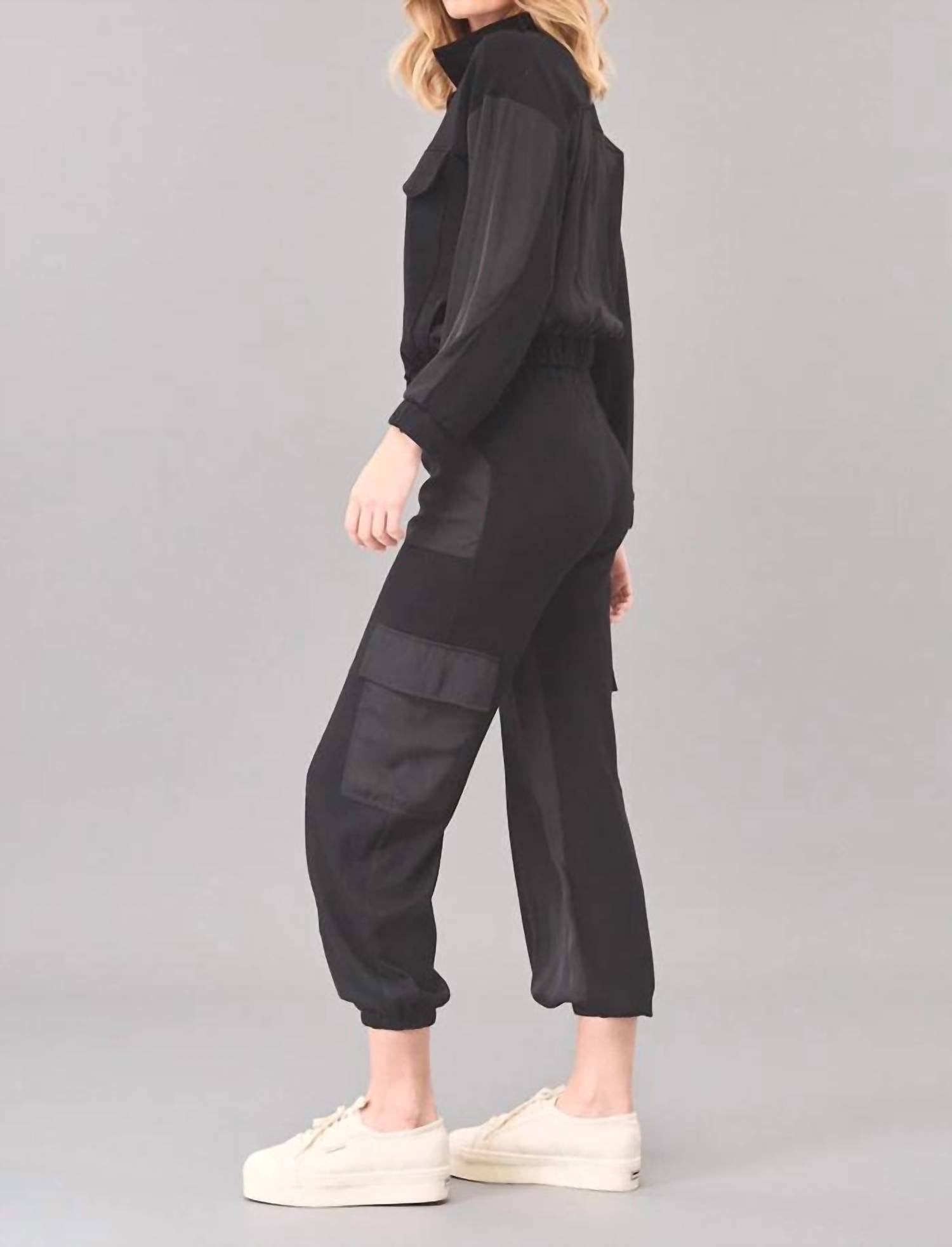 The perfect pant for running around town and looking cool while doing it. Introducing the Ponte Cargo Jogger by Lola & Sophie in a sleek black for everyday versatility. These joggers are crafted from a luxurious viscose blend, featuring a 29" inseam and a 12" front rise for a flattering high-rise fit. With a pull-on style and an elastic waist for comfort, these pants also include both front slash and side patch pockets. Care instructions suggest machine wash cold, and line dry, with the option of dry cleaning. Model is 5'10" and wears a size S, pairing effortlessly with the Luxe Ponte Hybrid Jean Jacket for a complete look.