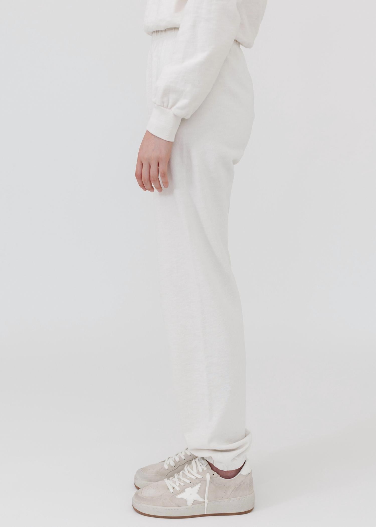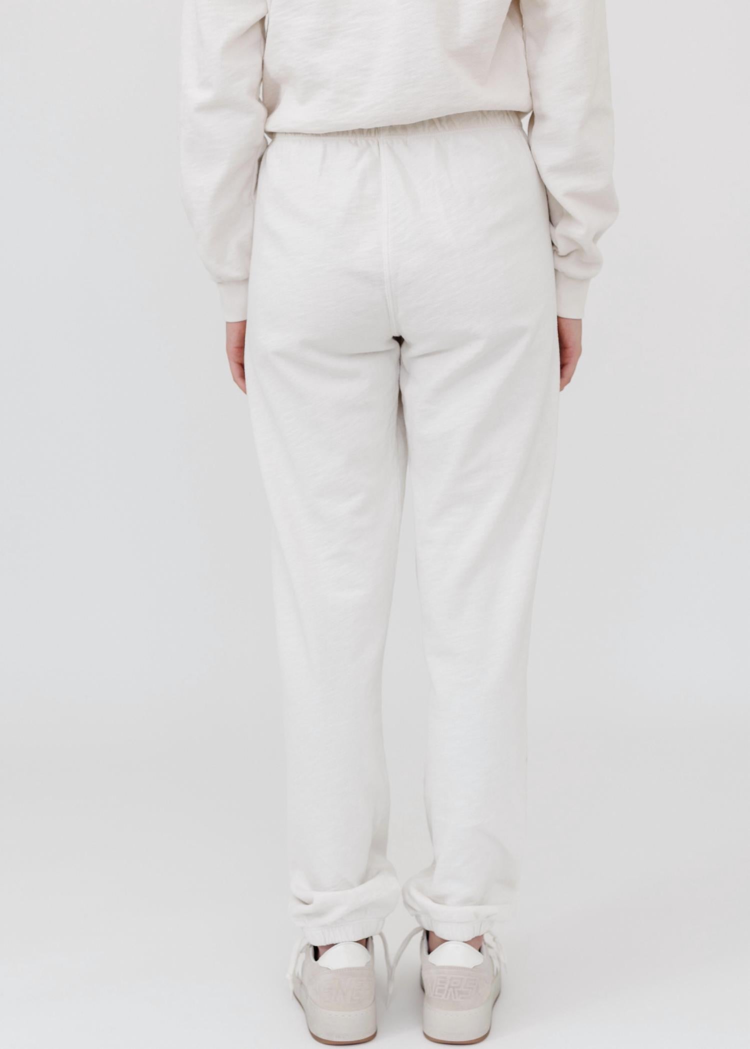 Pair these with your favorite sneakers for an effortlessly cool look. Discover the Éterne Vinny Sweatpant, a perfect blend of comfort and minimalist style crafted from 100% cotton, made in the USA. Designed in a relaxed fit with a high-rise waist, these sweatpants feature a tapered leg and practical pockets. The solid Bone color is complemented by a side zipper closure for added functionality. Care for these timeless track pants is simple with machine wash instructions included.