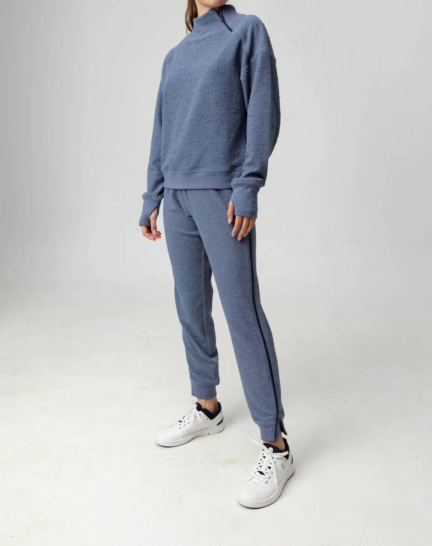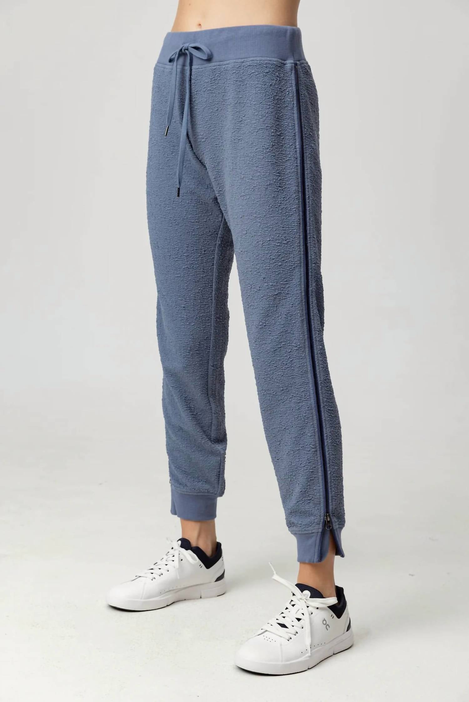 No gym necessary for these cool-girl joggers. Introducing the Adia Jogger by Sundays, a sleek addition to your sweats collection in a chic Steel Blue hue. These full-length joggers are crafted from a luxurious crinkle French terry of 100% polyester, offering a slim fit through the leg. With a pull-on rib waistband and no pockets, these joggers feature a full-length zipper on each leg's outseam. Care instructions include machine wash cold and tumble dry low, with a recommendation for best results to hang dry.
