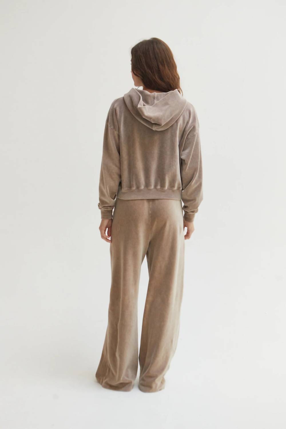 Pair these with your favorite sneakers for an effortlessly cool look. Introducing the Yazmin Velour Pant by Asher, a stylish choice in a soft latte hue designed for comfort and ease. These women's solid track pants feature a relaxed fit with a cozy wide-leg style, while the elasticated waistband offers a convenient pull-on closure. Crafted in LA from their initial yarn to the final garment, each piece undergoes garment-dyeing and enzyme & silicon washing for an exceptionally soft feel. With pockets included, these pants provide both fashion and function.