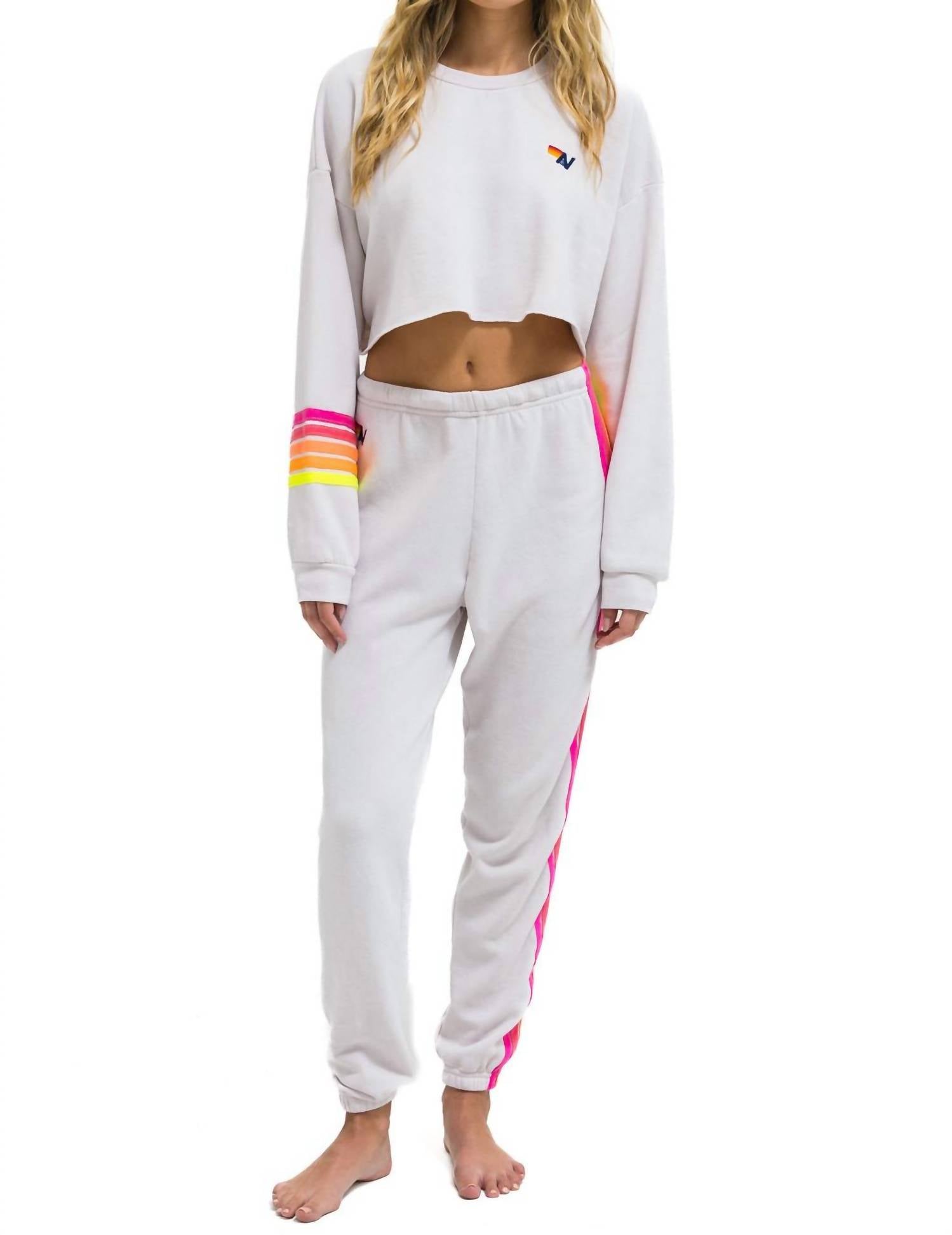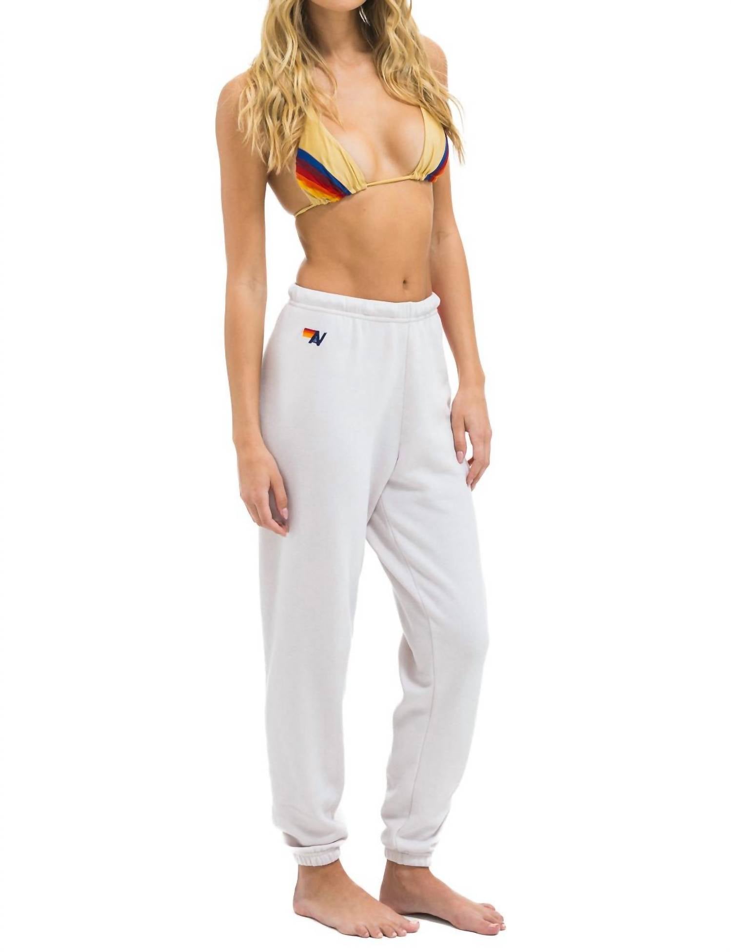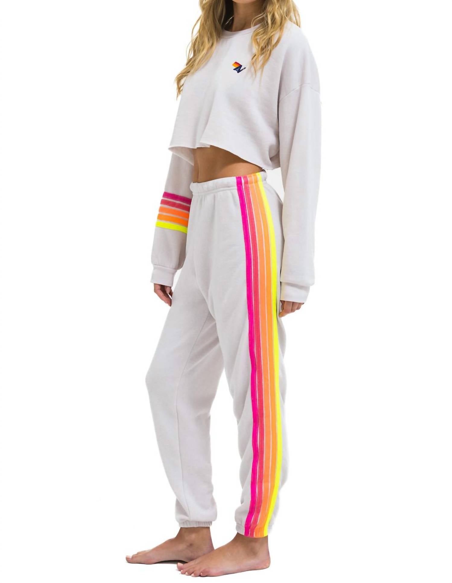 No gym necessary for these cool-girl joggers. Elevate your athleisure game with the 5-stripe Sweatpants by Aviator Nation, crafted in Dove Grey with vibrant neon stripe detailing. These sweatpants feature a mid-rise and regular fit with a tapered leg that ensures an effortlessly chic look, perfect for both workouts and casual outings. Made from a comfortable tri-blend of 50% polyester, 38% cotton, and 12% rayon, these pants are hand-sewn in the heart of Los Angeles, providing a unique, vintage feel. With a pull-on closure and practical pockets, maintenance is hassle-free with machine wash cold and tumble dry low instructions.
