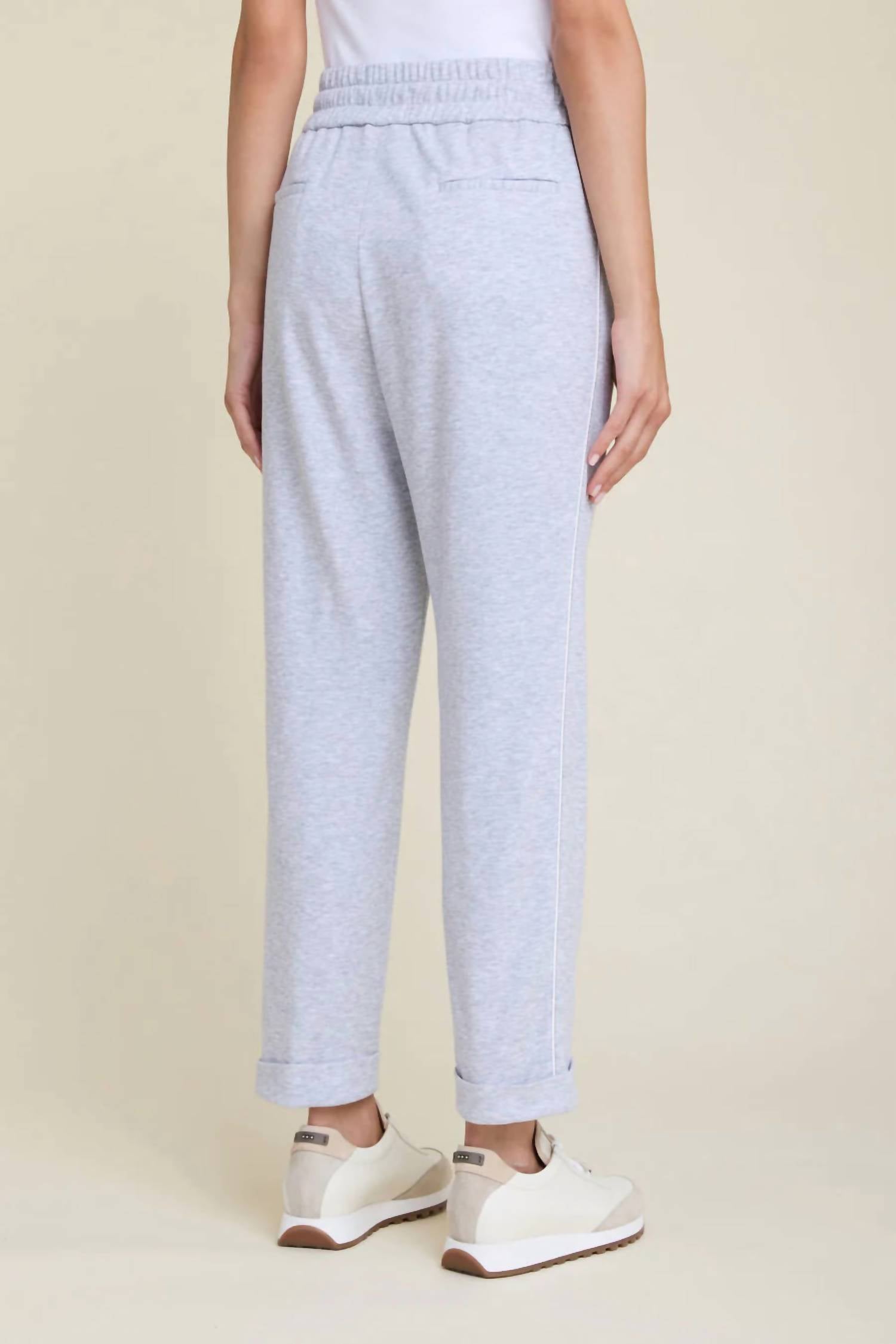 No gym necessary for these cool-girl joggers. Elevate your casual wardrobe with the Pull-on Elastic Jogger Pants by Erica Wilson, featuring a textured grey cotton blend for effortless style. These joggers come with a high-rise waist and relaxed fit, complete with a tapered leg design for a contemporary silhouette. Practicality meets comfort with inner side pockets, back welt pockets, and a convenient pull-on closure enhanced by an elastic and drawstring waist. The side band with piping detail adds a subtle highlight, making these joggers a chic addition to any wardrobe.