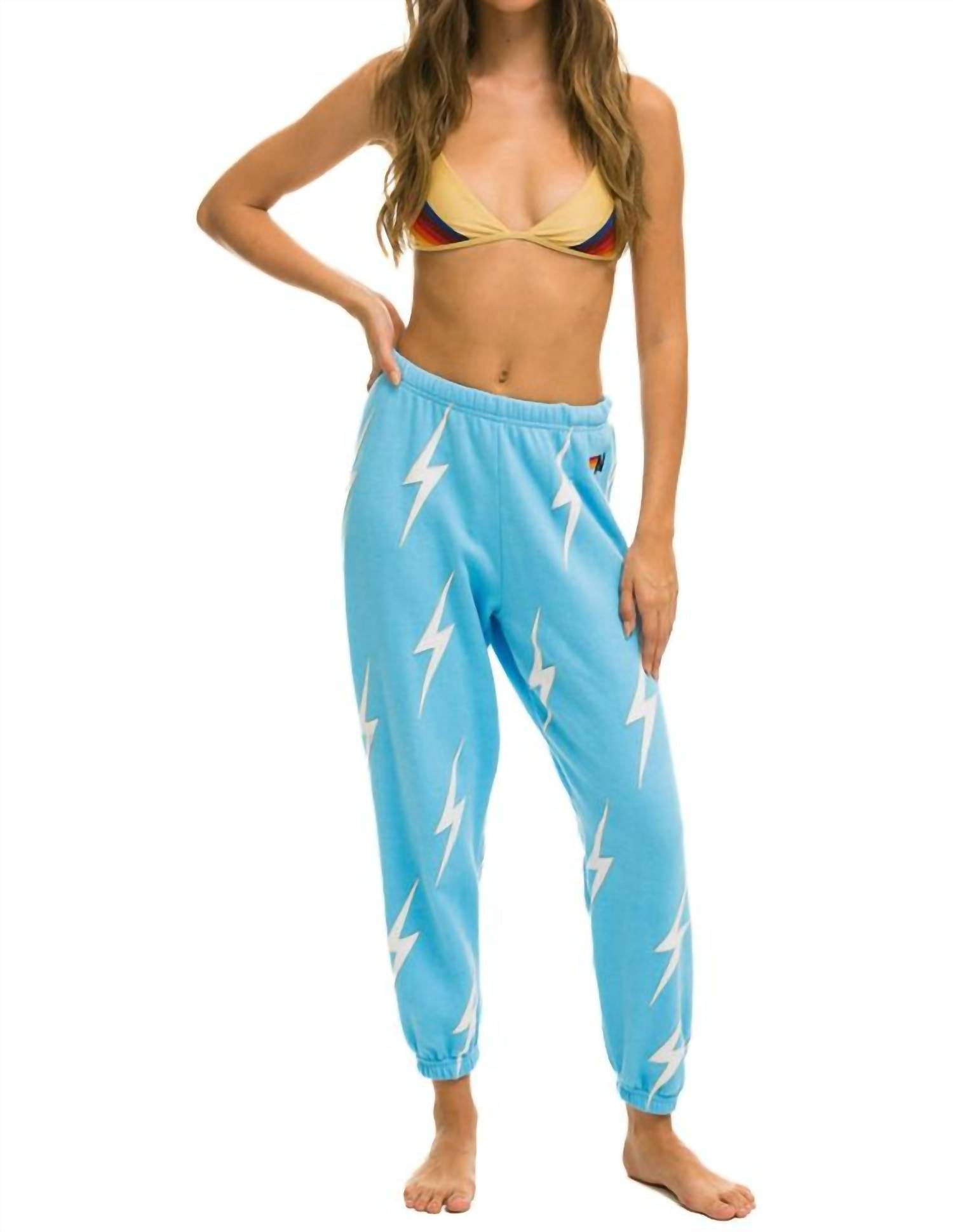 No gym necessary for these cool-girl joggers. Elevate your look with the AVIATOR NATION Bolt Stitch Repeat Sweatpant, a high-rise tapered leg track pant that embodies maximalist style. Made from a tri-blend fabric of 50% polyester, 38% cotton, and 12% rayon, this piece ensures unparalleled comfort. Designed with a pull-on closure and crafted in Los Angeles, each pant features a unique hand-stitched graphic bolt pattern in a striking sky and white colorway. Care instructions: Machine wash cold with like colors, hang or tumble dry on low. Models are wearing size XS.