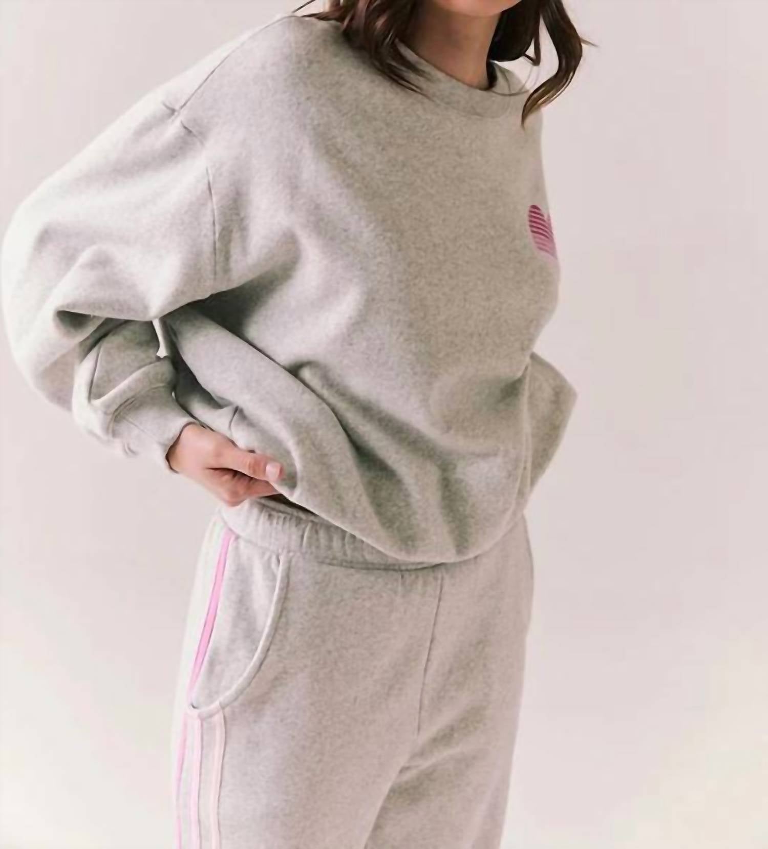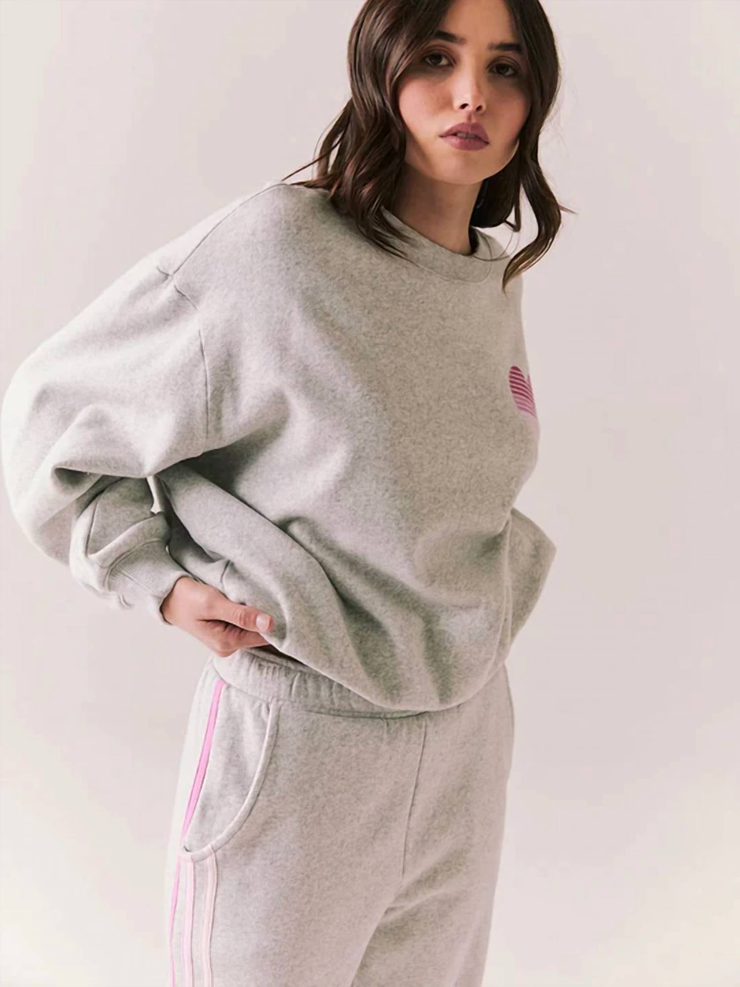 The perfect pant for running around town and looking cool while doing it. The sweatpants are light grey, featuring a wide-leg or relaxed fit and a ribbed waistband. Some similar styles incorporate a subtle design element, like the faint pink lines visible on the lower cuff of the sweatpants.