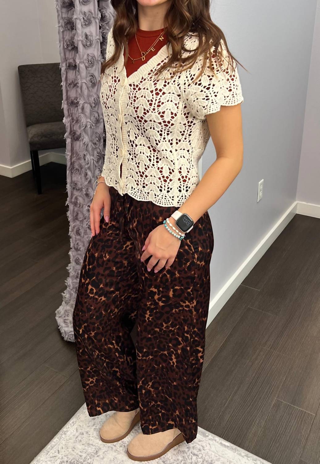 No gym necessary for these cool-girl joggers. Unleash your fierce style with the On The Prowl Satin Joggers by Dex, adorned in a bold leopard print. Crafted with a sleek satin material, these pants boast a relaxed fit with a flowy wide-leg cut. Equipped with a comfy pull-on drawstring waist and practical pockets, they zoom effortlessly from lounge to luxe. For easy maintenance, simply machine wash.