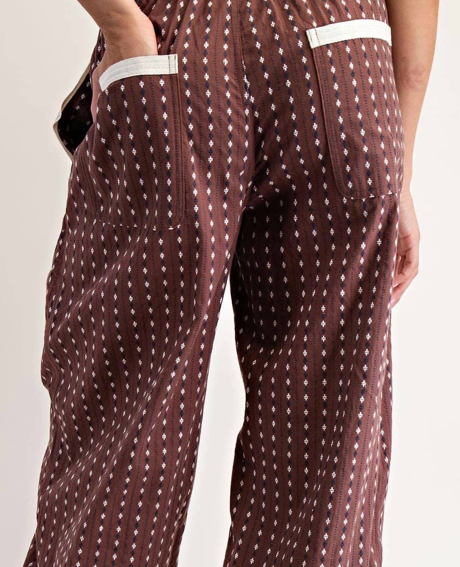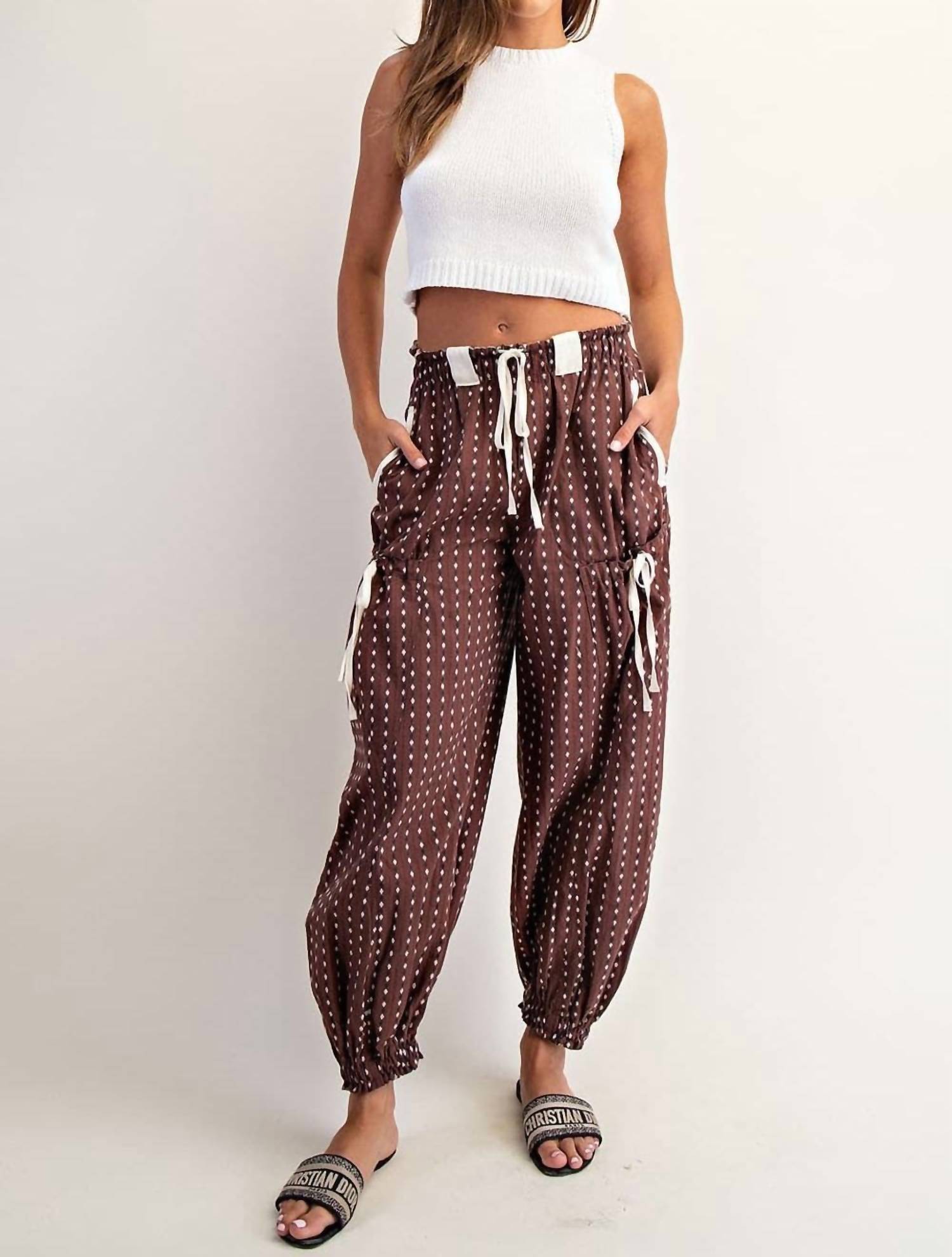 No gym necessary for these cool-girl joggers. Introducing the ee:some Soft Washed Micro Diamond Striped Joggers, perfect for a relaxed, utility-inspired look in rich brown. These pants feature a comfortable pull-on closure with an elastic waistband and contrasting drawstring, complemented by elasticized cuffs. Made from 100% cotton, they boast a mid-rise, relaxed fit with a tapered leg and practical side hip pockets, cargo pockets with a drawstring cinch, and back welt pockets. Machine washable and suitable for line drying, these joggers are a minimalist summer essential.