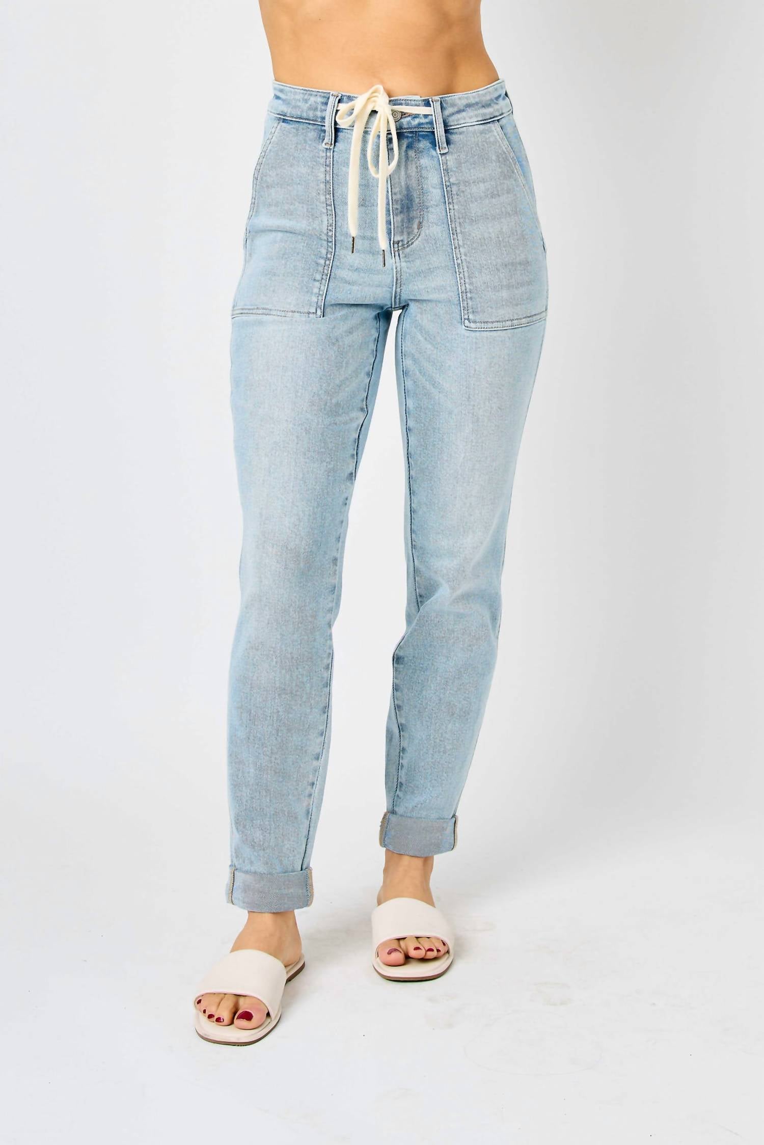Pair these with your favorite sneakers for an effortlessly cool look. Introducing the On A Roll Jogger Pants by Judy Blue, a stylish addition to your casual wardrobe. Designed for women, these track pants feature a high rise with an 11-inch waist rise and a tapered leg for a comfortable fit. Made from a versatile cotton blend material in a solid pattern, they offer flexibility with a button closure. Complete with a light wash denim finish, these joggers are perfect for a holiday party or as part of your streetwear look.