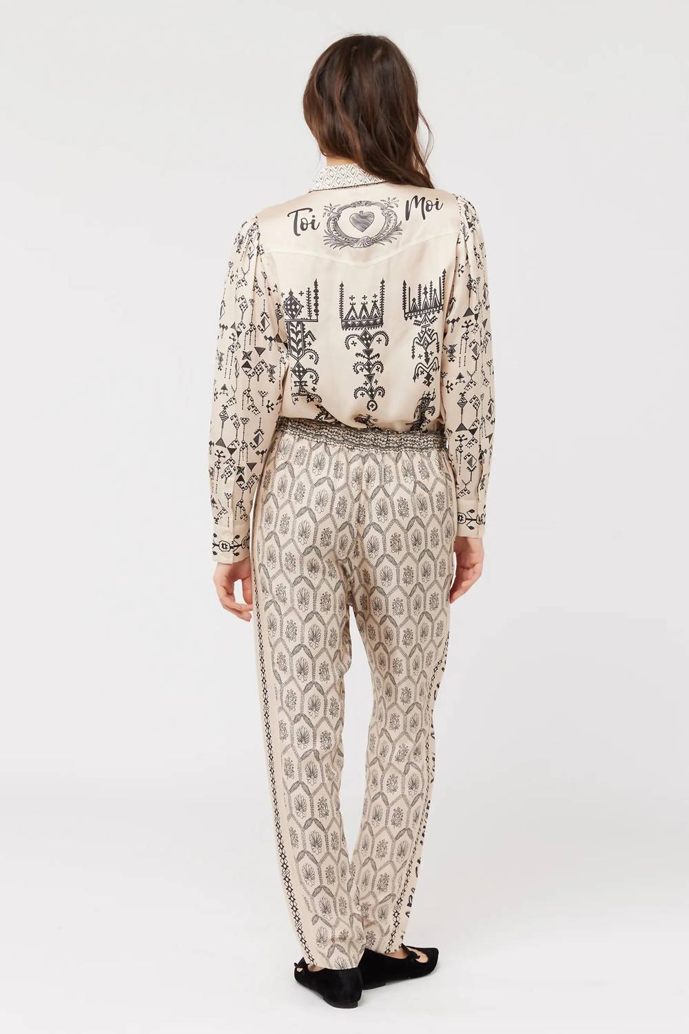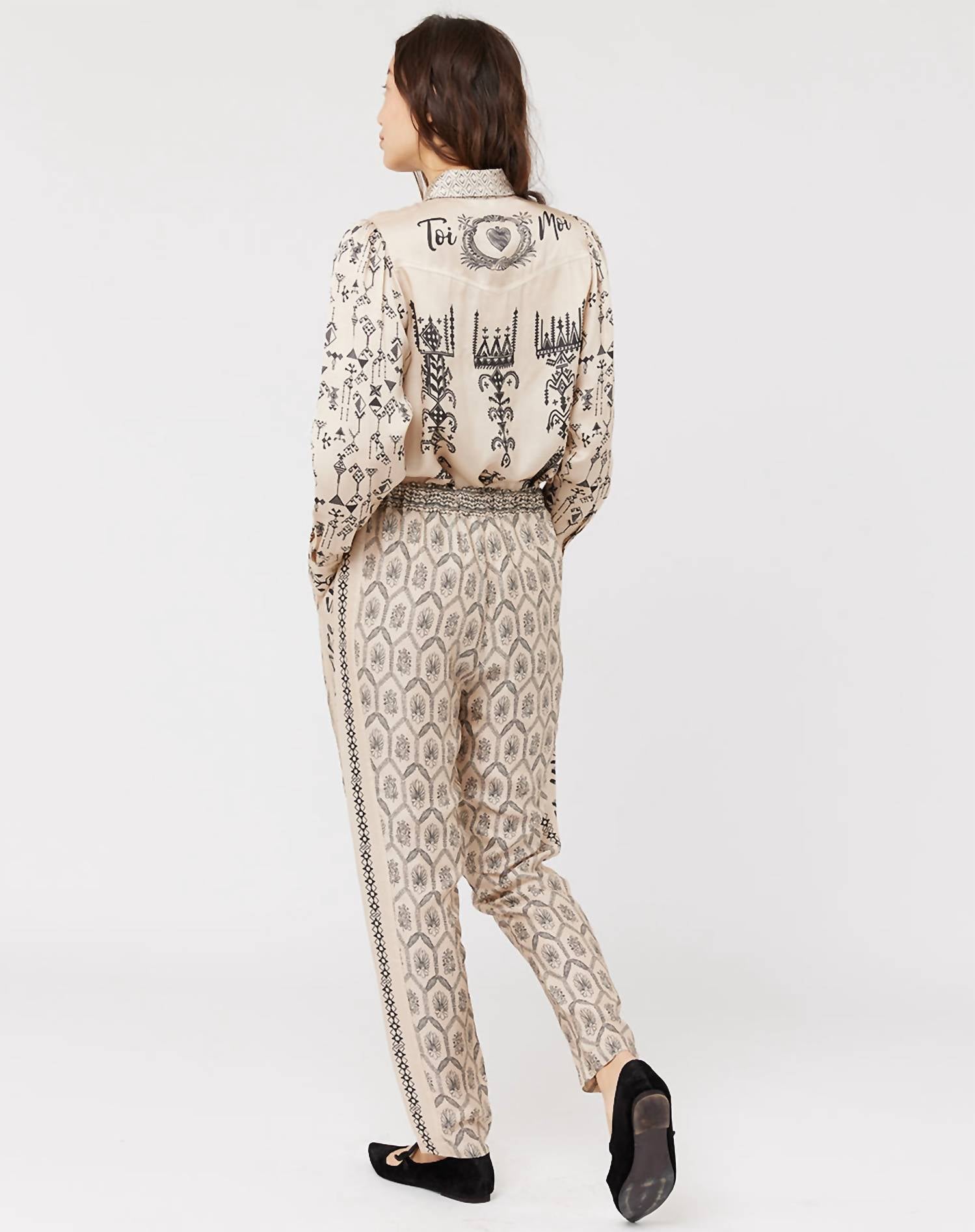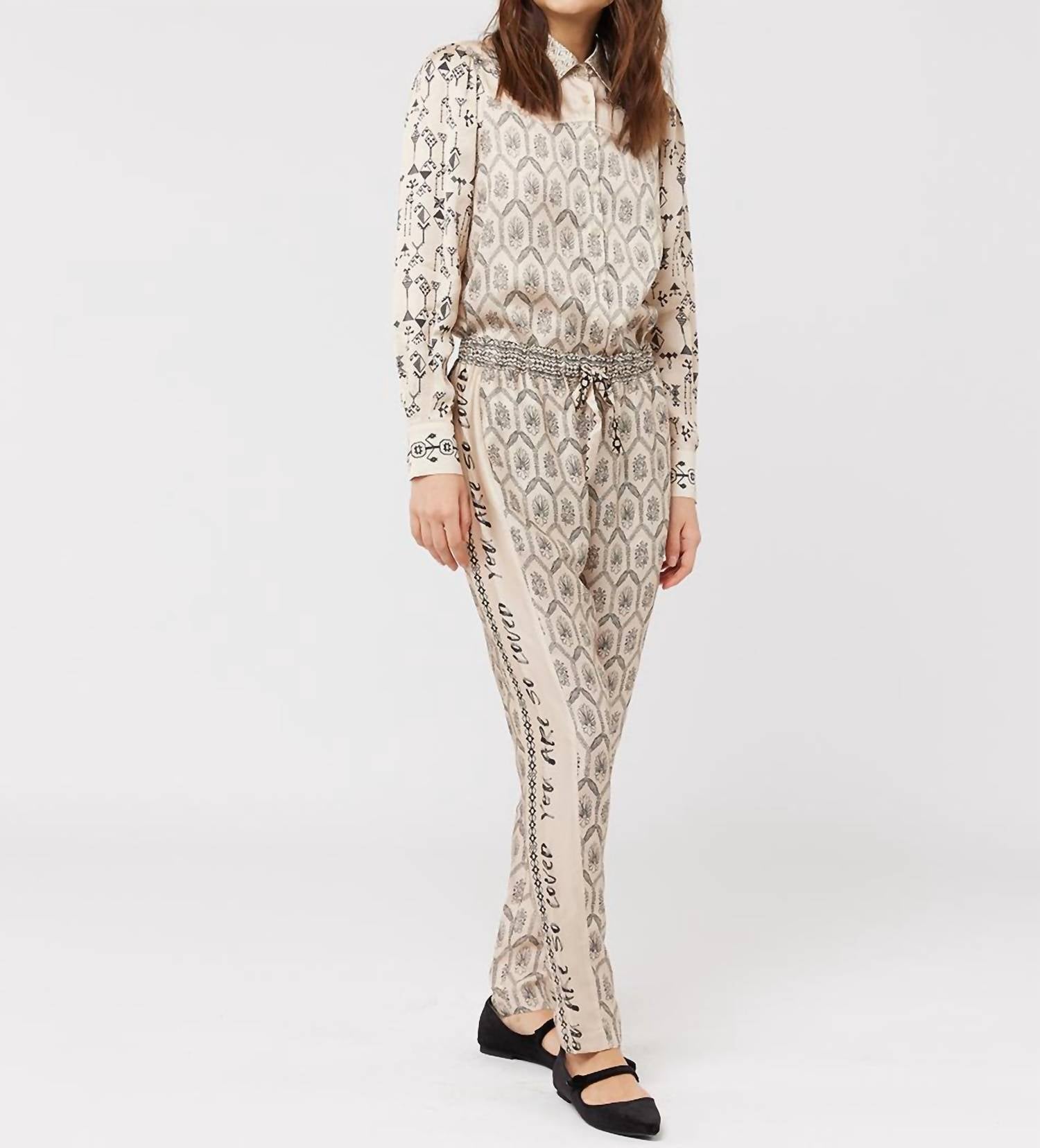 Step into effortless style with the Ember Blossom Print Tapered Leg Track Pants by Me369, showcasing a chic geometric-meets-floral pattern. Crafted from 100% Viscose, these tan track pants feature a mid-rise elastic waist with a tie closure for a comfortable fit. The classic tapered leg design is ideal for both lounging and casual outings, plus the "YOU ARE SO LOVED" detail adds a touch of positivity. Care instructions include hand washing in cold water and laying flat to dry.