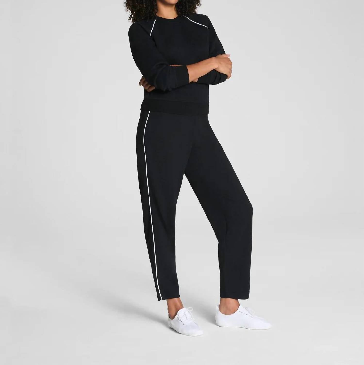 The perfect pant for running around town and looking cool while doing it. Introducing the Spanx Air Pique Carrot Ankle Pants in classic black, crafted for a sophisticated and minimalistic look. Made from a blend of 52% Tencel™ Modal, 40% Polyester, and 8% Elastane, these pants promise a luxuriously soft touch with a lightweight fine knit structure. The tapered leg design features a high-rise and relaxed fit for ultimate comfort, perfect for travel or lounging. Care: Machine wash cold on a gentle cycle, do not use fabric softener, tumble dry low, low iron if needed, or dry clean. Closure: Pull on. Imported.