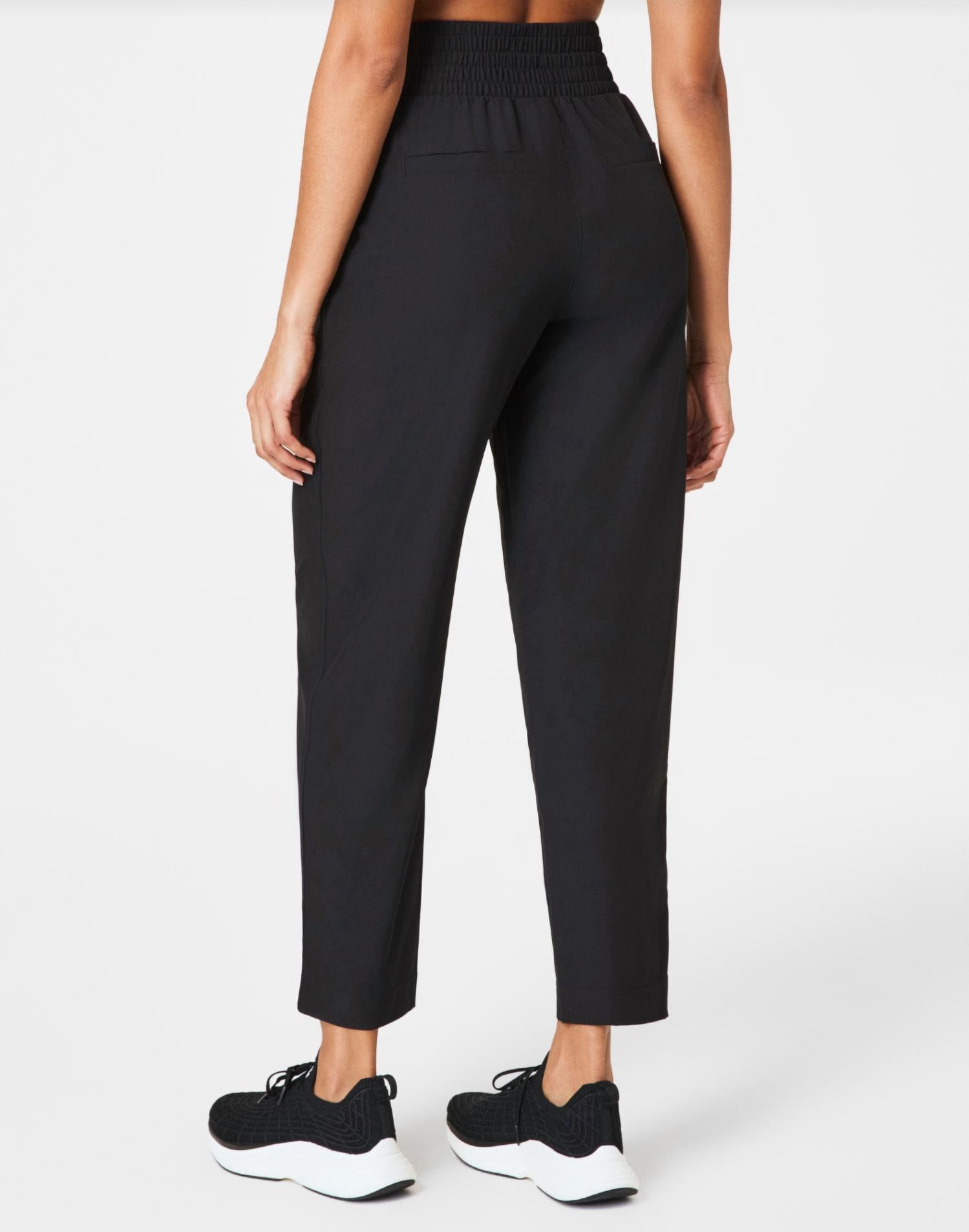 The perfect pant for running around town and looking cool while doing it. Introducing the On The Move Slim Track Pant by Spanx, designed in a sleek Very Black color for ultimate versatility. With a high-rise, slim fit that provides a tailored style intended to hit at the ankle, these pants are crafted from an 86% polyester and 14% elastane blend, ensuring breathability and a sweat-wicking, anti-static finish. The flat-front waistband features an adjustable drawstring for a custom and secure fit, complemented by convenient front pockets with hidden snaps and back welt pockets. With built-in UPF 50+ sun protection, these imported pants are perfect for active pursuits and casual wear, and are easy to care for with machine wash and tumble dry instructions. Inseam options include; Petite 26".