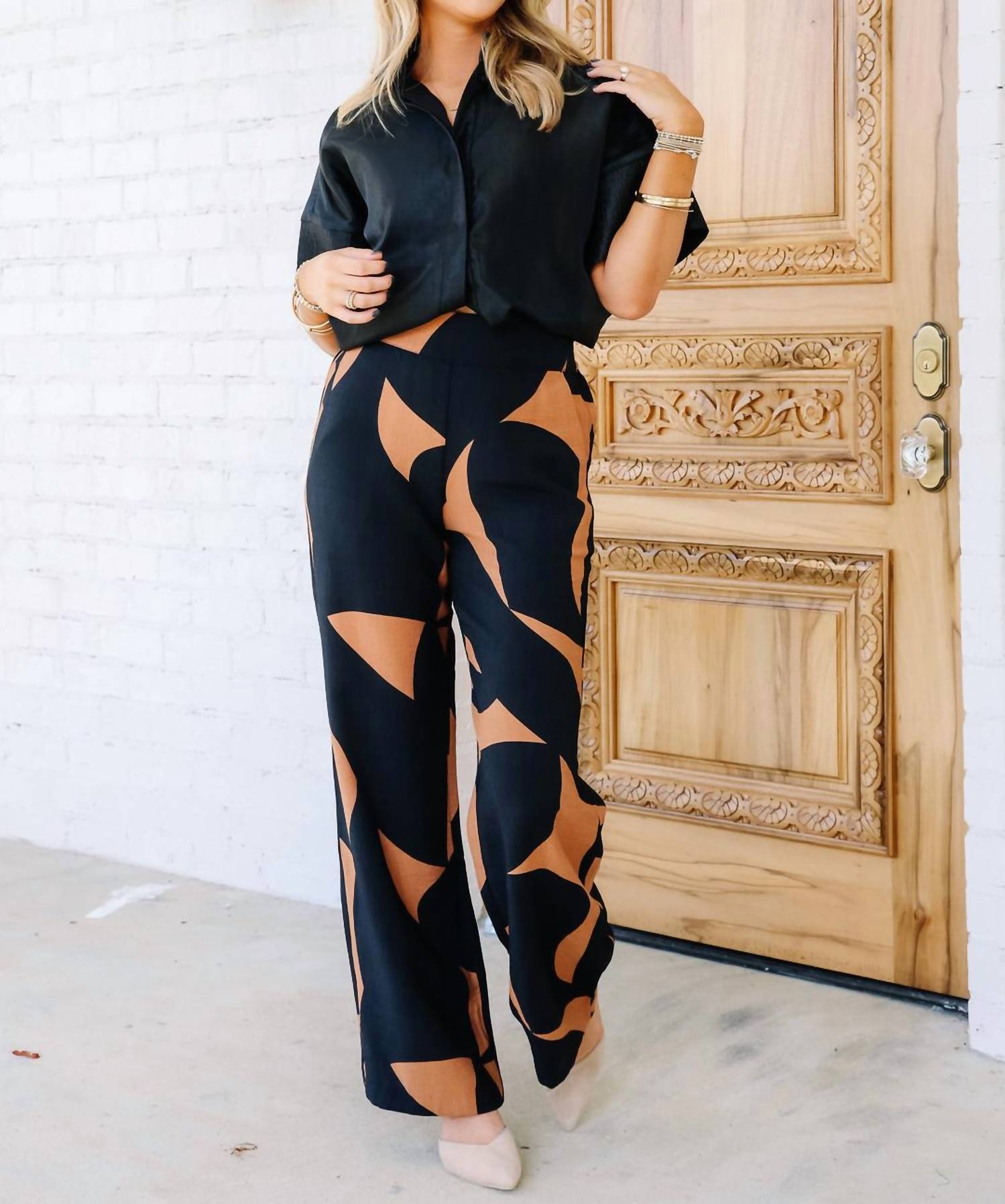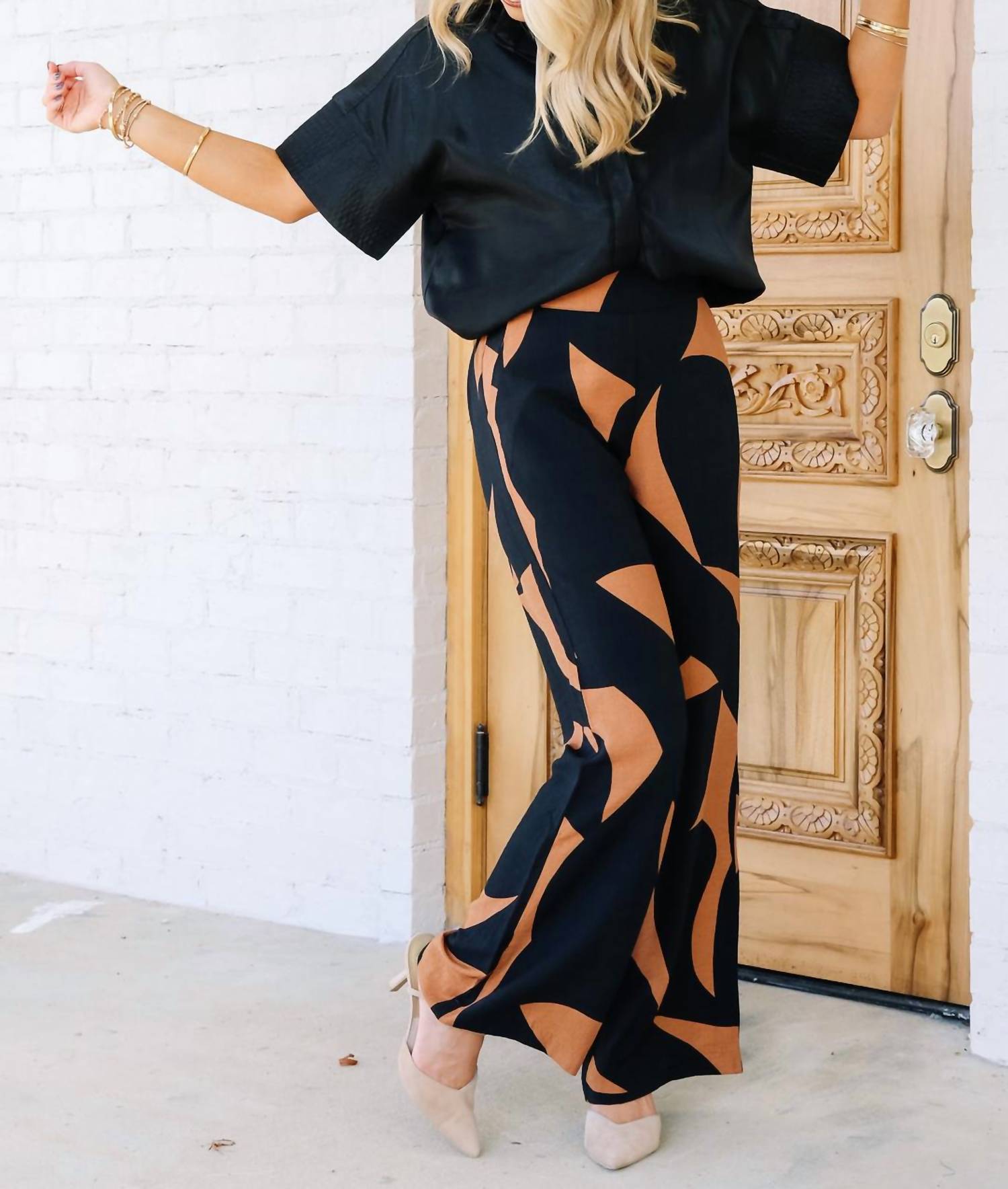 Pair these with your favorite sneakers for an effortlessly cool look. Embrace the perfect blend of comfort and style with the Pull On Pant With Smocked Back by TRIBAL in a striking Bran hue. Crafted from Rayon, these women's joggers feature a relaxed fit with wide legs and a mid-rise waist, ideal for Spring outings. Designed for a pull-on ease, these patterned track pants offer a seamless silhouette without pockets. Care for these pants by hand washing and laying flat to dry.