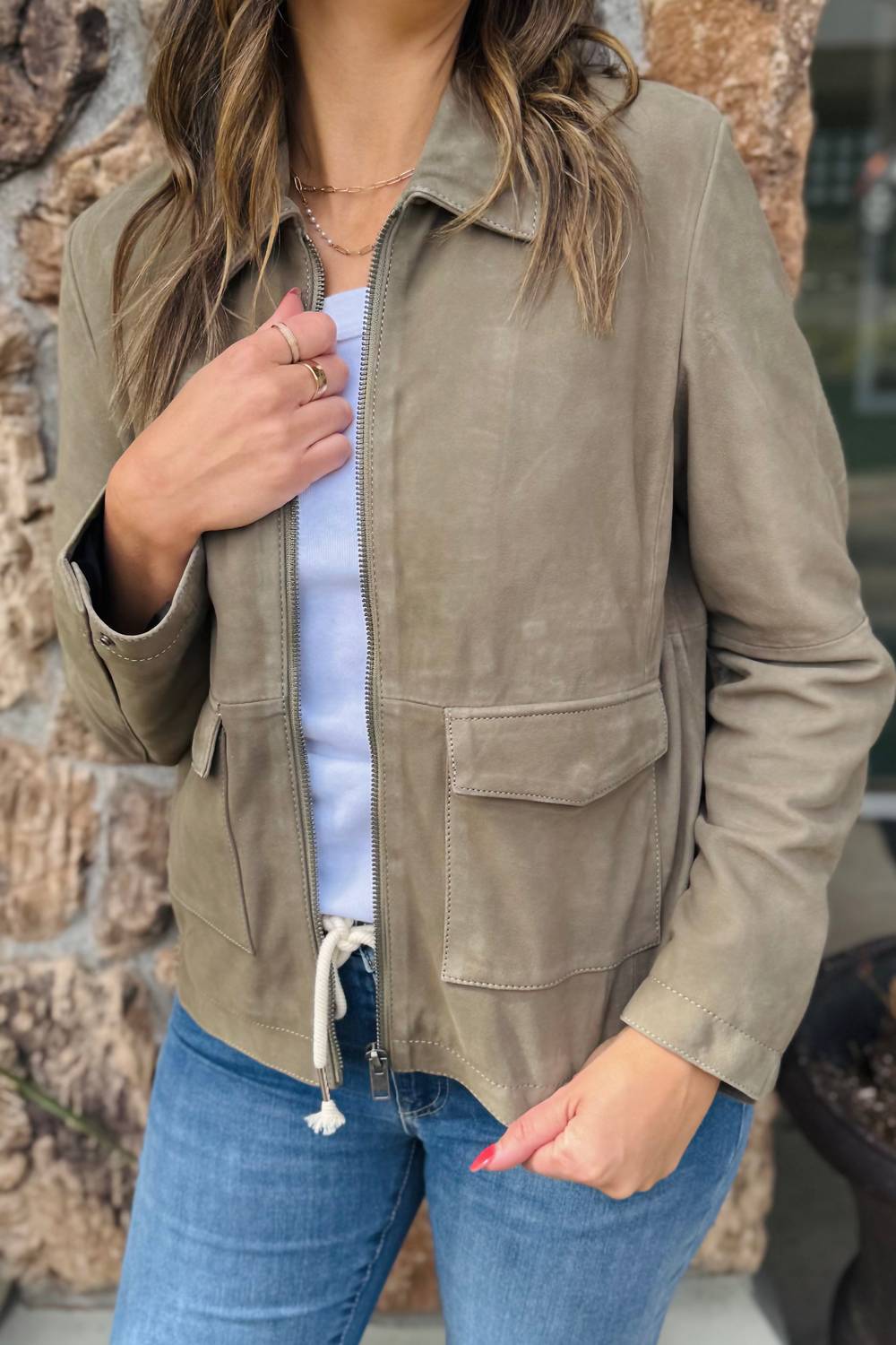 Everyone needs a leather jacket like this in their closet. Introducing the MAURITIUS Yaima Jacket, a stylish upgrade for any wardrobe with its light sage color and luxurious long sleeve design. Crafted from 100% genuine lamb leather, this patterned shacket-style jacket promises a comfort fit, ideal for game day outings. Its thoughtful zip closure and functional pockets add practicality to the elegance. Care for this high-quality piece with professional leather cleaning only.