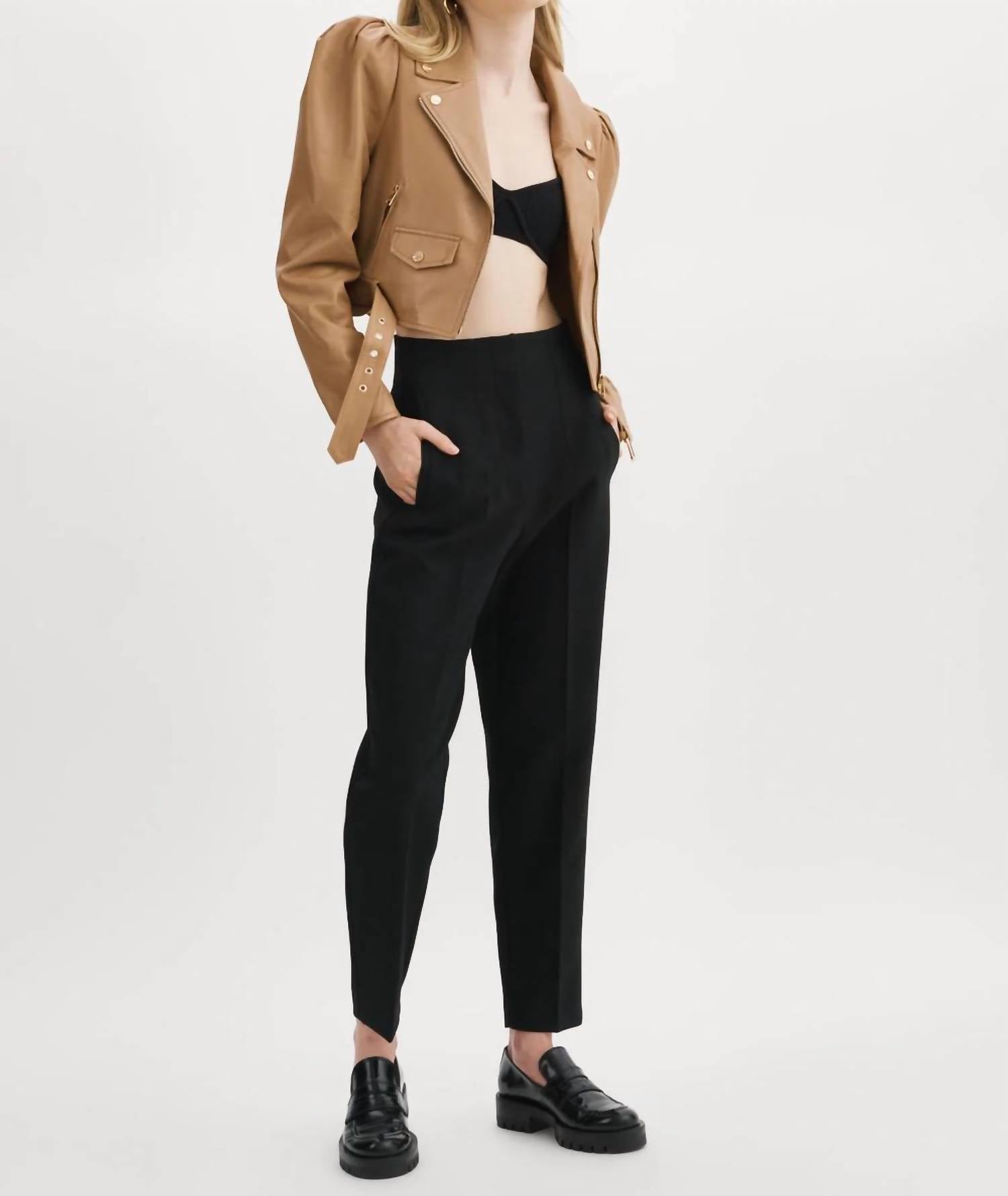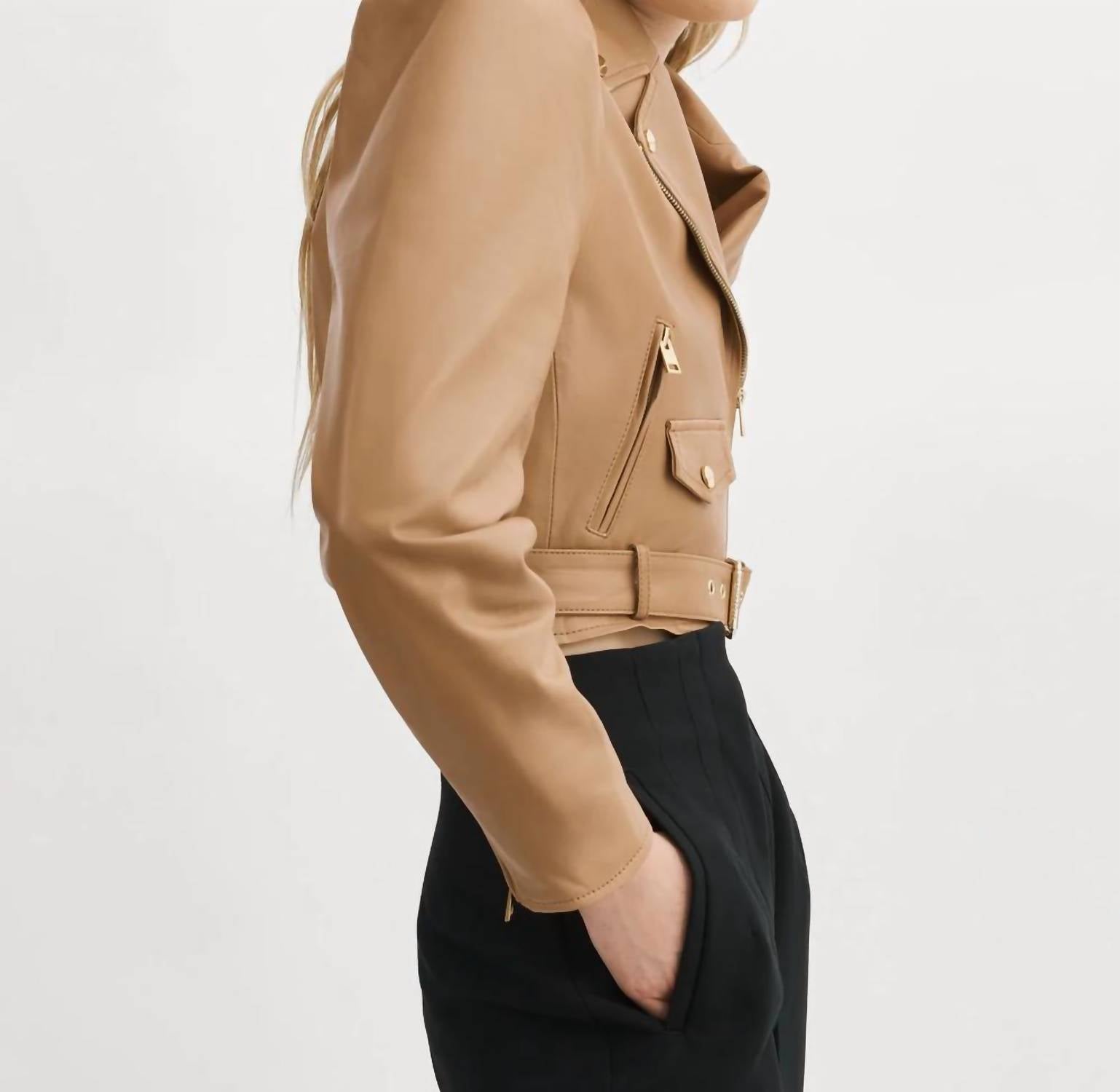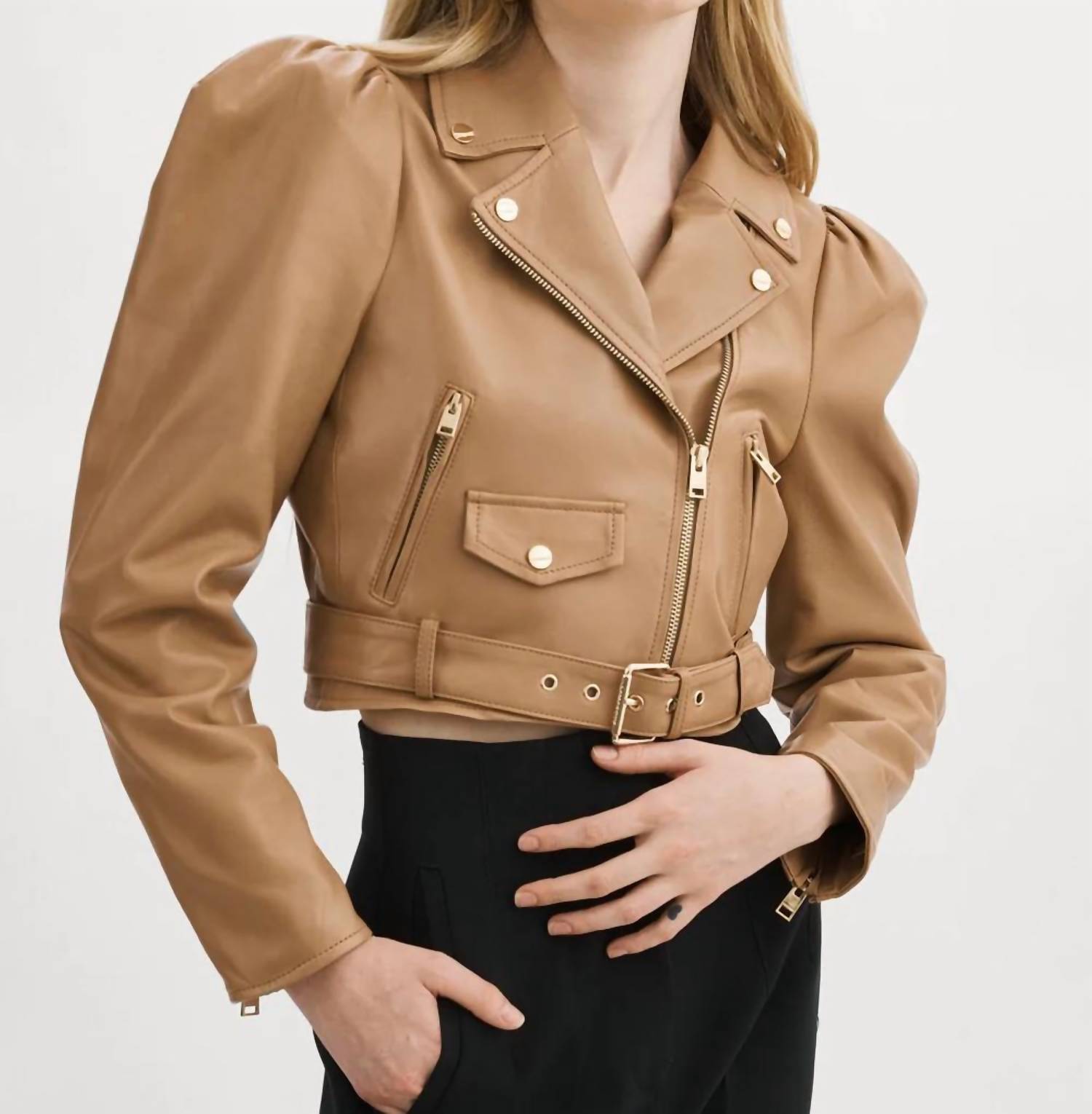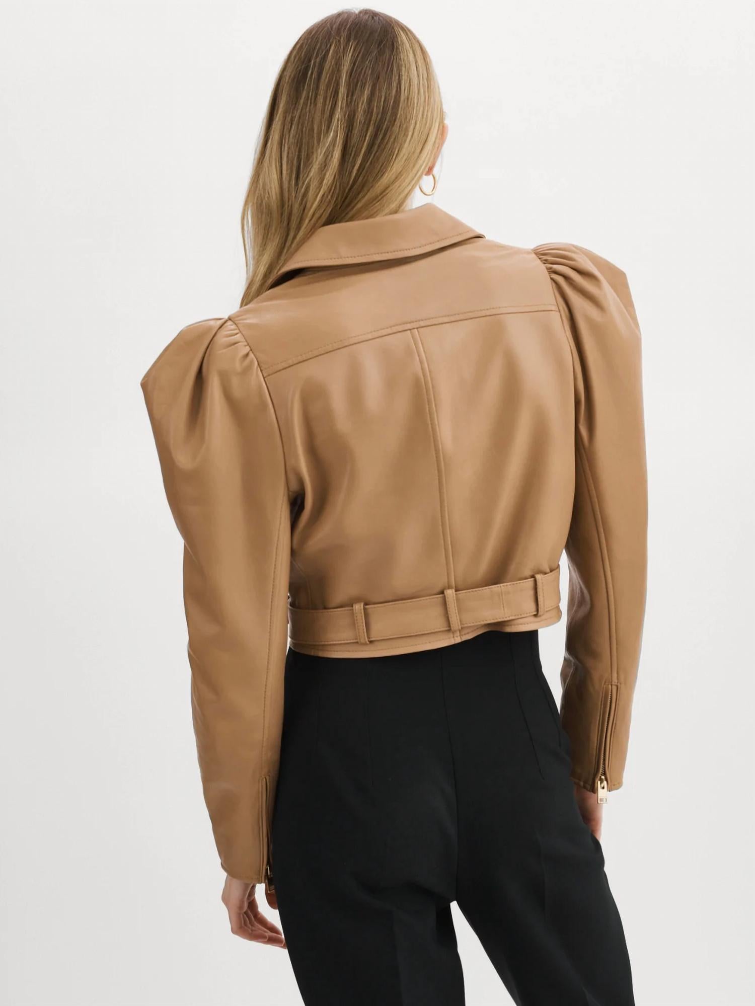 Everyone needs a leather jacket like this in their closet. Make a statement with the Charnesa Leather Jacket by LAMARQUE in a sophisticated Sesame hue. This women's long sleeve jacket showcases puffed shoulders, a notch lapel, and a cropped length of 17.25 inches for a modern twist on a classic style. Skillfully crafted from 100% lamb leather with a stretch polyester-spandex lining, it features a zip closure and branded gold hardware. Complete with functional zippered sleeves, a removable waist belt, and a front flap pocket, care for this piece requires dry cleaning.