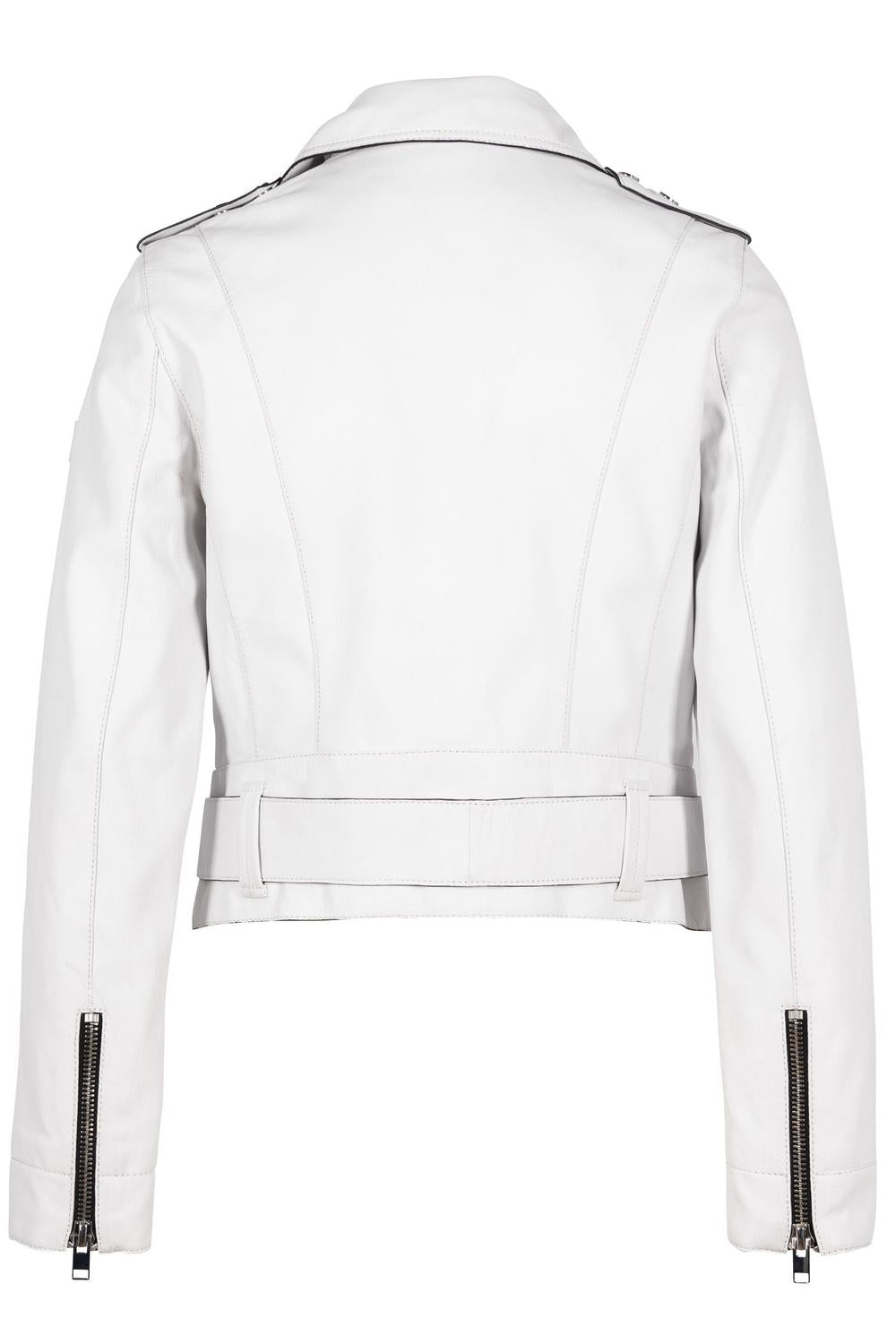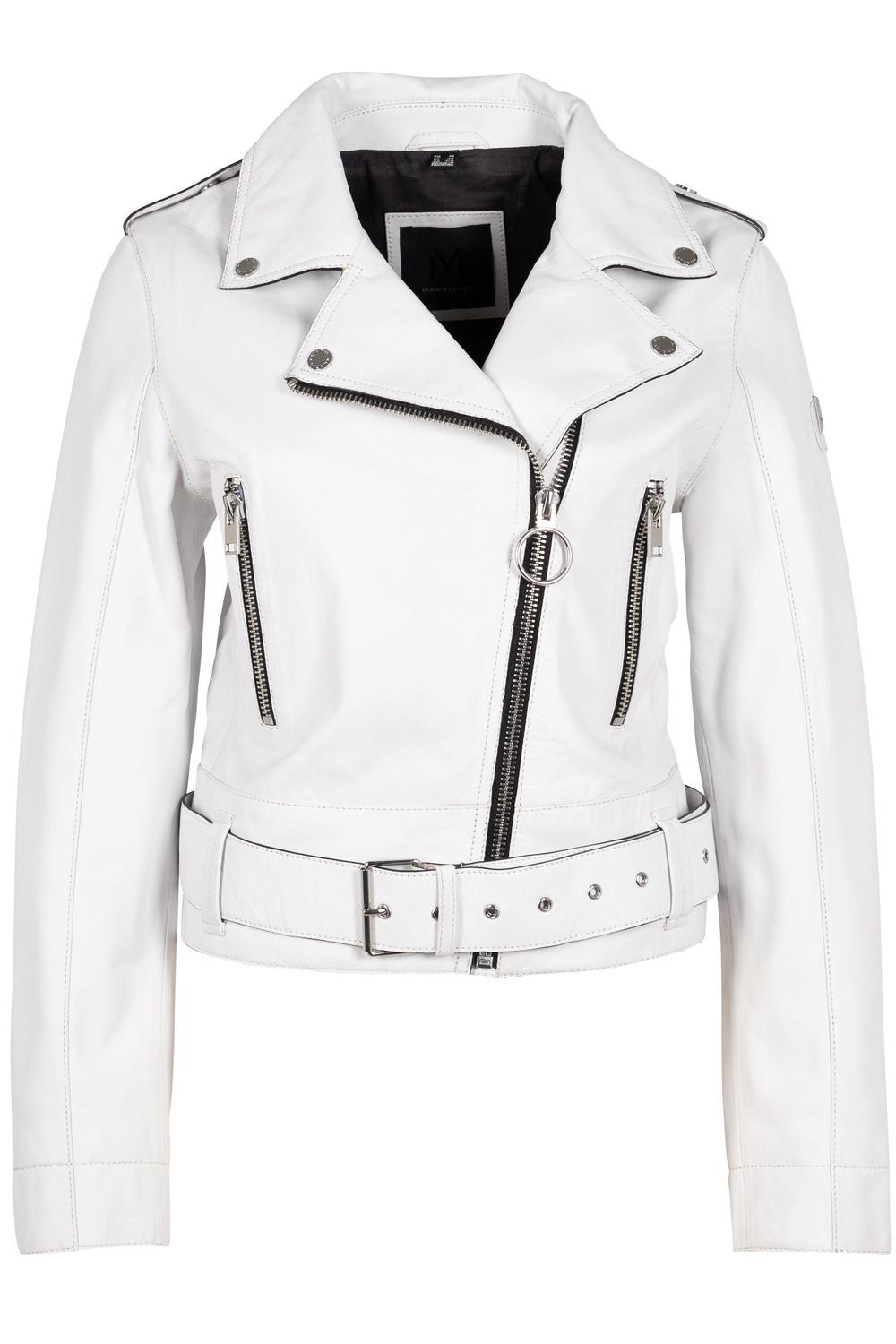 Soft leather, impeccable design. This leather jacket is a win-win. Introducing the Women's Celine Leather Jacket by MAURITIUS, a streetwear staple in a solid white finish. This summer-ready jacket boasts long sleeves and is crafted from 100% lambskin leather, featuring a chic bottom and belt detail at the waist. With a practical zip closure and pockets, it's as functional as it is fashionable. Please note that care and origin information are not provided.