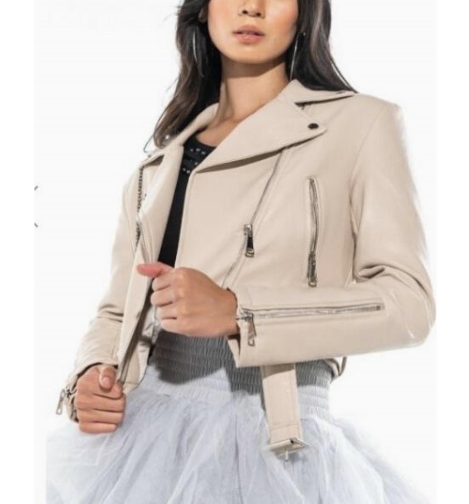 Everyone needs a leather jacket like this in their closet. The Attalae Moto Jacket by AZALEA WANG is a minimalist piece perfect for a chic vacation look. Crafted from durable polyurethane, this solid beige leather jacket is designed with long sleeves and a classic collared neckline. It features a convenient zip closure and pockets, adding both style and practicality. An ideal choice for fall, this jacket embodies a timeless elegance that aligns with a minimalist trend.