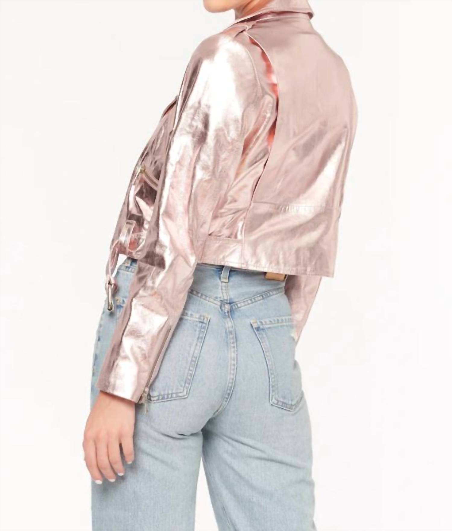 Soft leather, impeccable design. This leather jacket is a win-win. Meet the Kali Crop Jacket by Cami NYC, a stunning rose gold women's leather jacket designed to elevate your fall wardrobe with a nod to 90s fashion. This solid pattern jacket features long sleeves and is crafted from 100% genuine leather for a luxurious feel. With its cropped silhouette, zipper closure, notch collar, and silver hardware, it effortlessly combines edgy and sophisticated elements. Made for layering over your favorite pieces, this imported jacket requires dry cleaning and steaming to maintain its elegance. Model is wearing size XS.