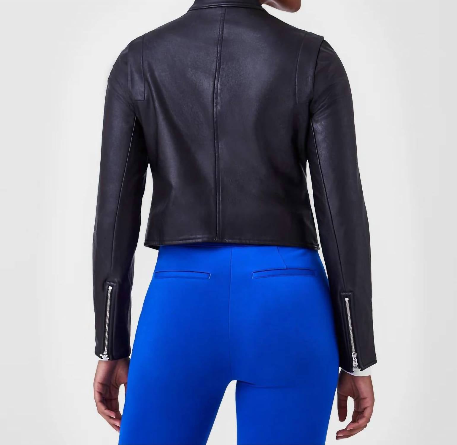 Edgy style meets all-day comfort. Features long sleeves and a crewneck design. Crafted from a blend that includes 92% Polyester and 8% Elastane with a Polyurethane coating. Offering a leather appearance with fabric flexibility. Hip-length and lined for added warmth. Offers functional pockets and zippers at the sleeves for practicality and style. With a zip closure for secure fit. Easy to care for with a machine wash on a gentle cycle.