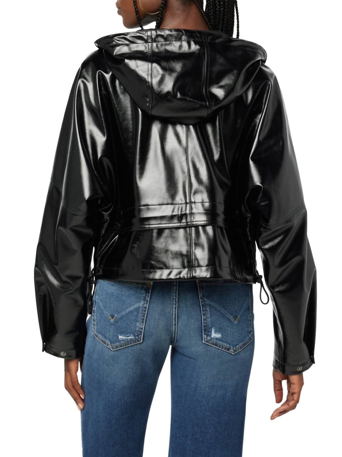 A leather jacket so good, it works with just about any outfit. The Waltz Liquid Leather Cropped Fit Jacket by Hudson showcases modern luxury with its Patent Vegan Leather construction in a sleek black shade. Designed with long sleeves and a hooded neckline, it's tailored for a loose, cropped fit that features a zip closure. Enhance your silhouette with adjustable drawcords on the hood, hem, and back, adding a custom touch to your ensemble.