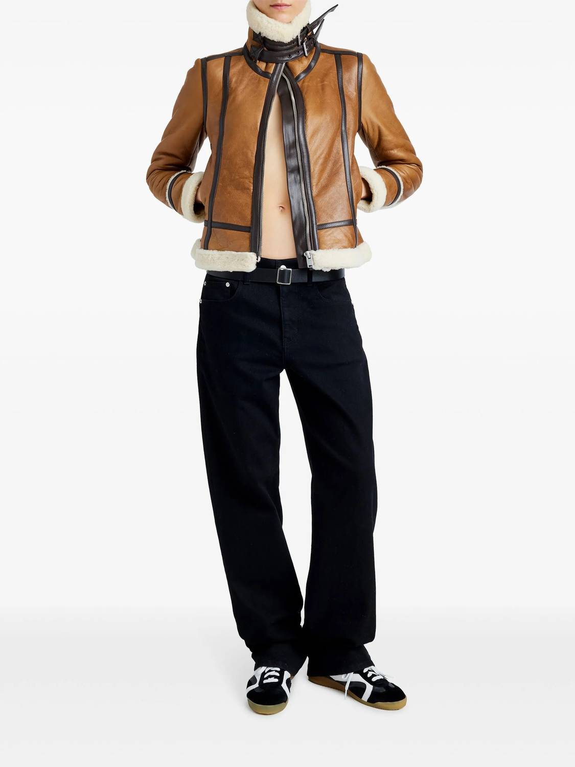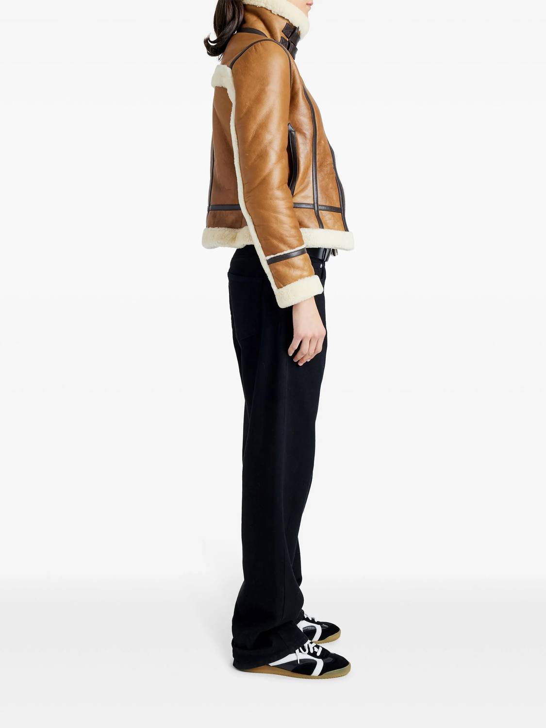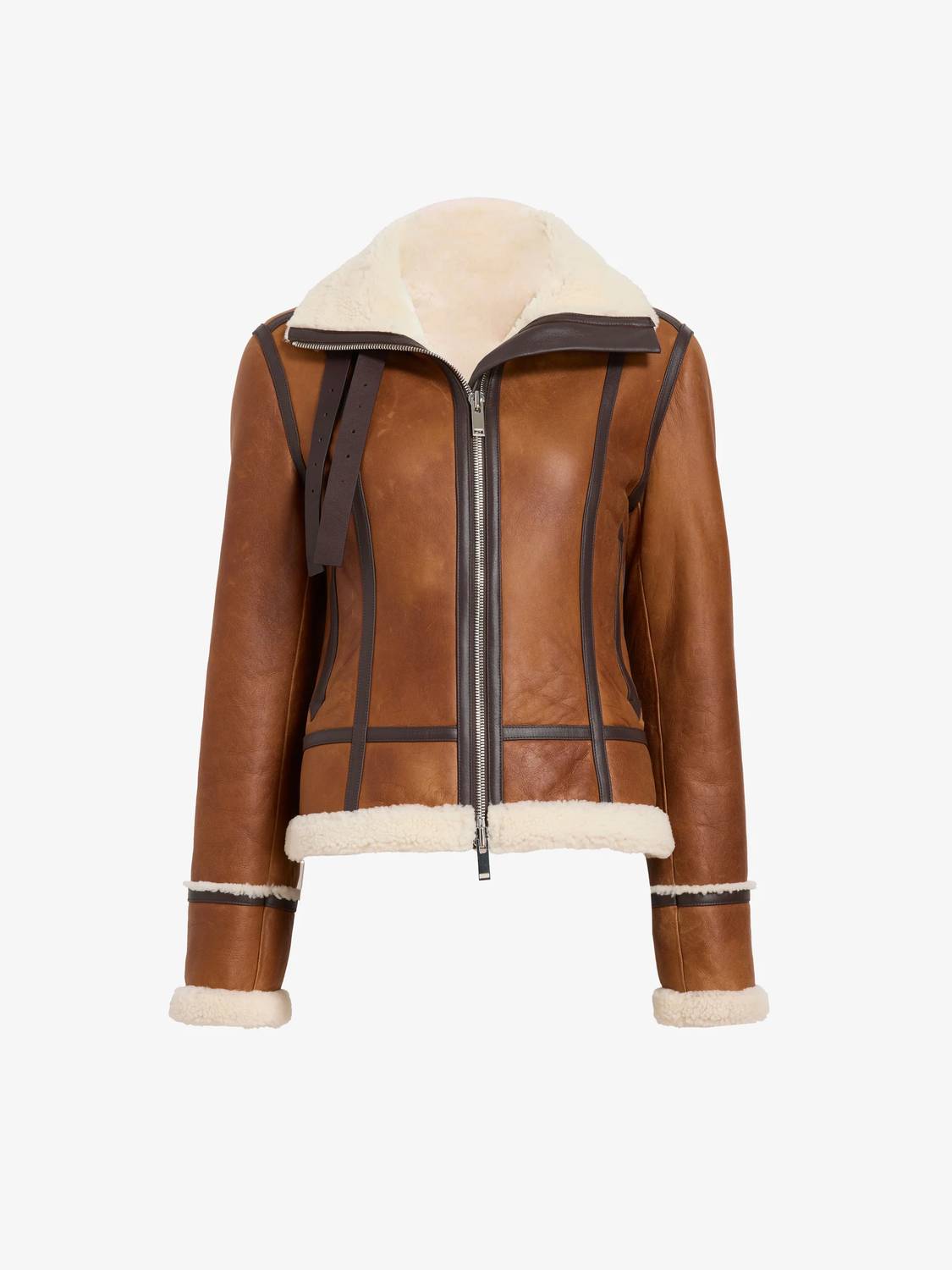 Everyone needs a leather jacket like this in their closet. Introducing the Arlo Jacket in Leather Back Shearling by Proenza Schouler, tailored for those who appreciate luxury in Umber tones. This women's jacket features long sleeves and a plush shearling lining, complemented by silver-tone hardware for a sleek finish. Composition: 100% lambskin with a two-way zip closure enhanced by double-buckled straps around the adjustable collar. Care: Dry clean only. Enjoy the practicality of side slip pockets and embrace winter in style with this slim-fitting jacket.